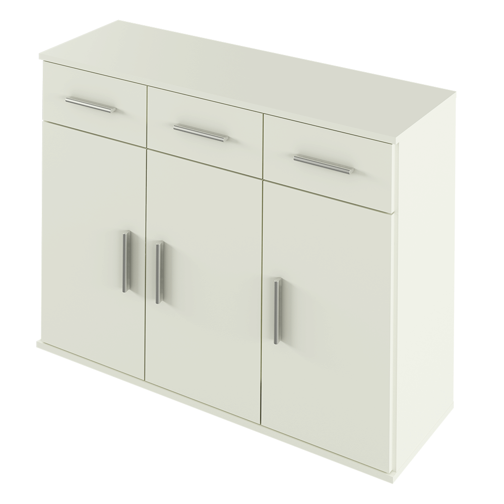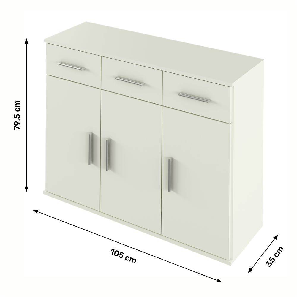 Materiál: DTD laminovanáFarba: bielaRozmery (ŠxHxV): 105x35x79,5 cmTrojdverováTri skrinkyTri šuplíkyS úchytkamiDodávané v demonte