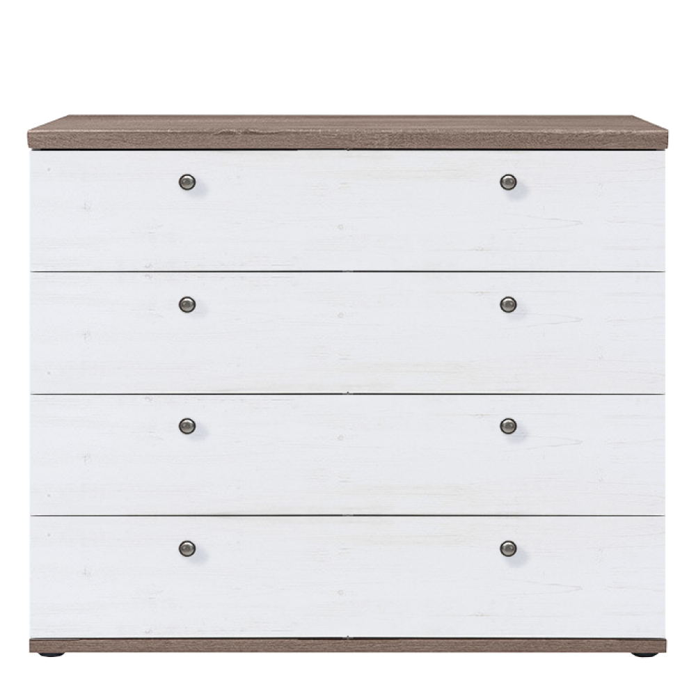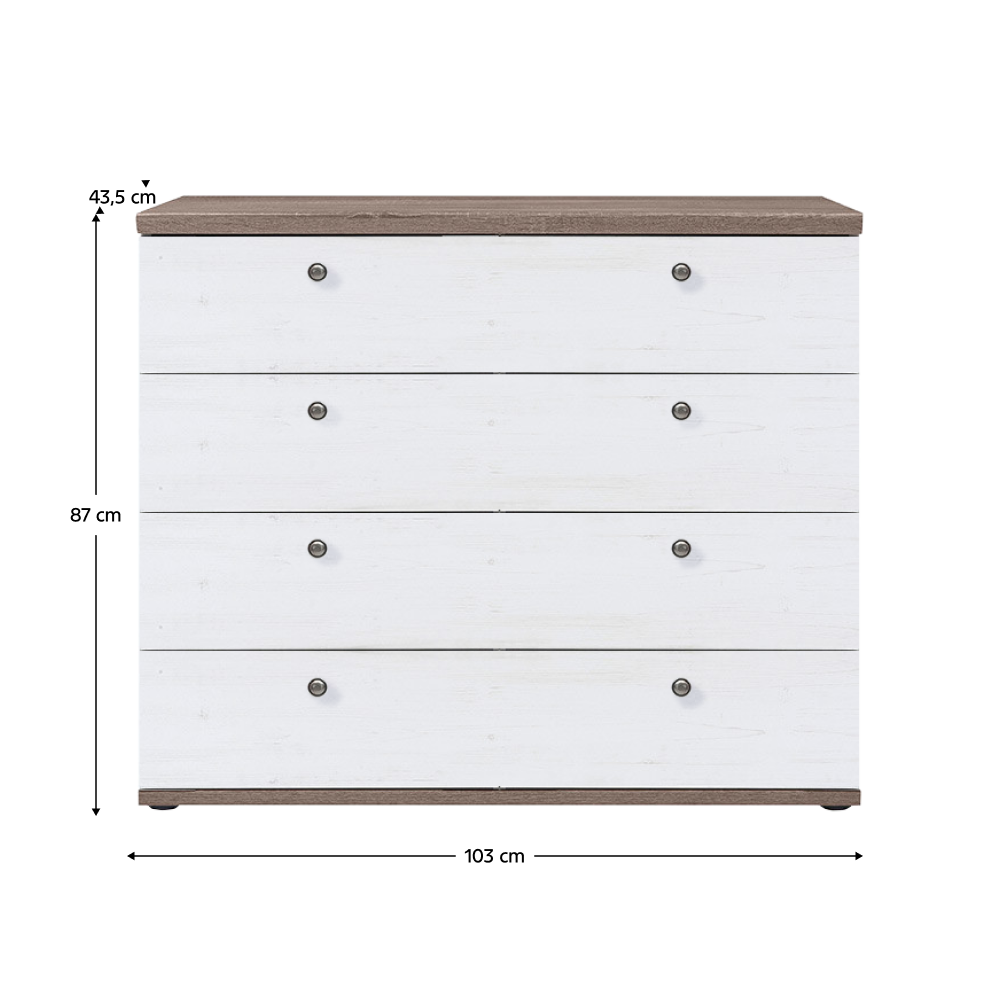 Materiál: laminovaná DTDFarba: borovica canyon/dub sonoma trufelRozmery (ŠxHxV): 103x43,5x87 cmHrúbka materiálu: 1,6 cmS úchytkamiMateriál úchytiek: kovFarba úchytiek: stará strieborná4 šuplíkyNosnosť šuplíka: 3 kgModerný dizajnOdporúčame pripevniť k steneDodávané v demonte