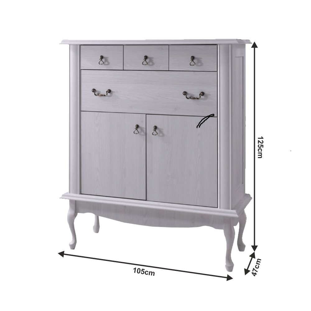 Materiál: DTD laminovaná/ABS hranyFarba: sosna bielaRozmery (ŠxHxV): 105x47x125 cmVýška spodného priestoru od podlahy: 25 cmHrúbka materiálu: 30 mmŠtyri šuplíky3D efektKovové úchytkyDrevené nožičkyABS hranyBarokový štýl