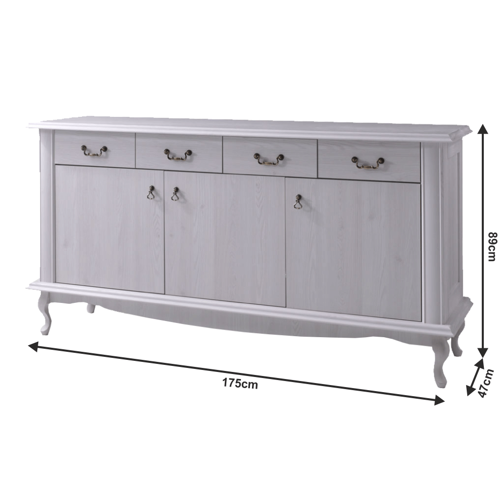 Materiál: DTD laminovaná/ABS hranyFarba: sosna bielaRozmery (ŠxHxV): 175x47x89 cmVýška spodného priestoru od podlahy: 15 cmHrúbka materiálu: 30 mmDve skrinkyŠtyri šuplíky3D efektKovové úchytkyDrevené nožičkyABS hranyBarokový štýl