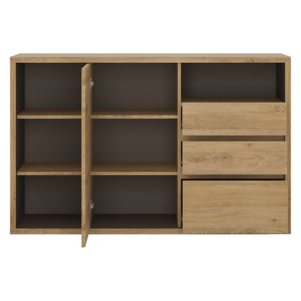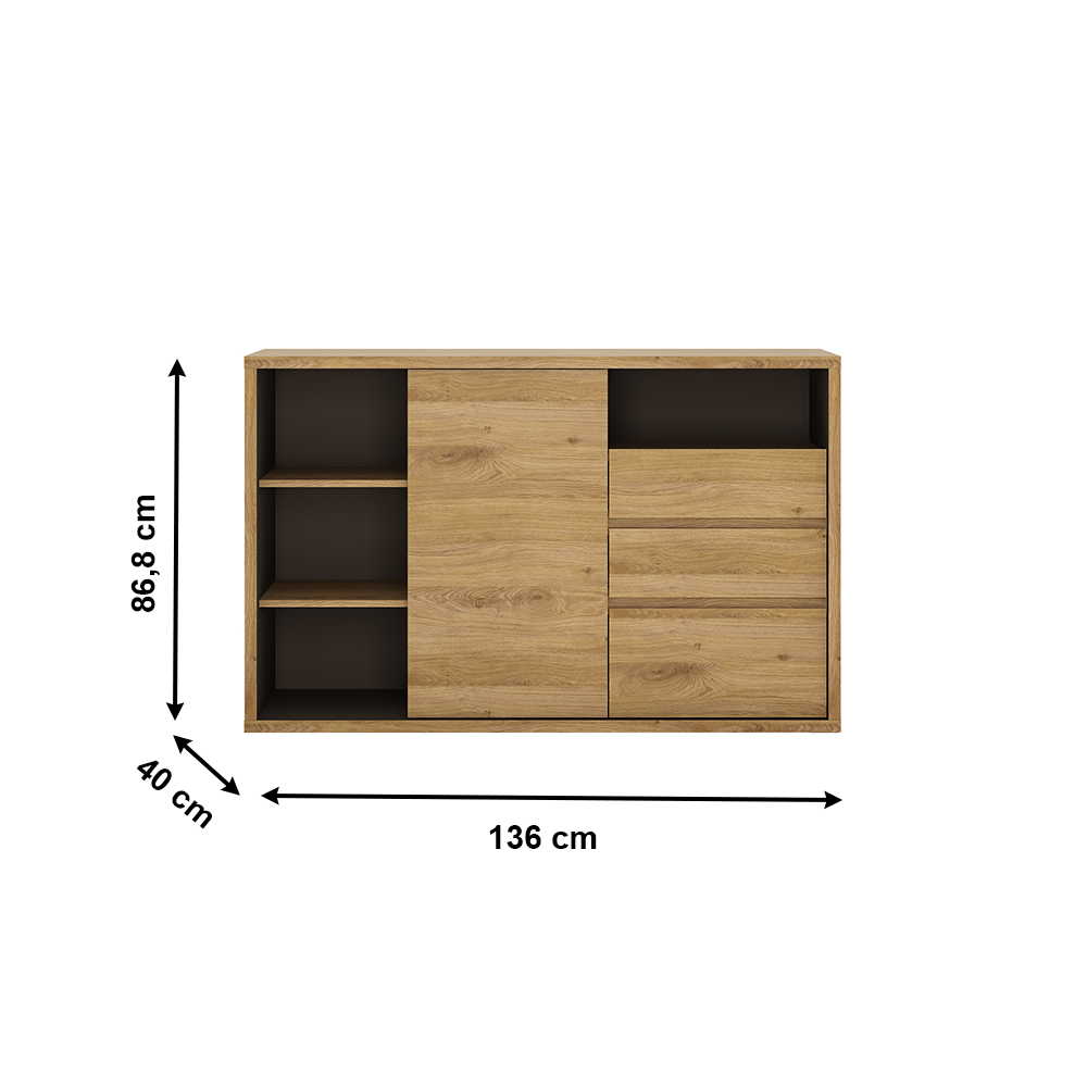 Materiál: laminovaná DTDFarebné prevedenie: dub Shetland/siváRozmery (ŠxHxV): 136x40x86,8 cmHrúbka korpusu: 2,8 cmBez úchytkováJednoduchá a elegantnáHrubý korpus3 šuplíky4 poličky1 jednodverová skrinka1 otvorená skrinkaModerný štýlVysoká kvalitaPrecízne spracovanieOdolná voči poškriabaniu, UV žiareniu, vysokým teplotámNosnosť poličky: 5 kgNosnosť šuplíka: 5 kgDodávané v demonte