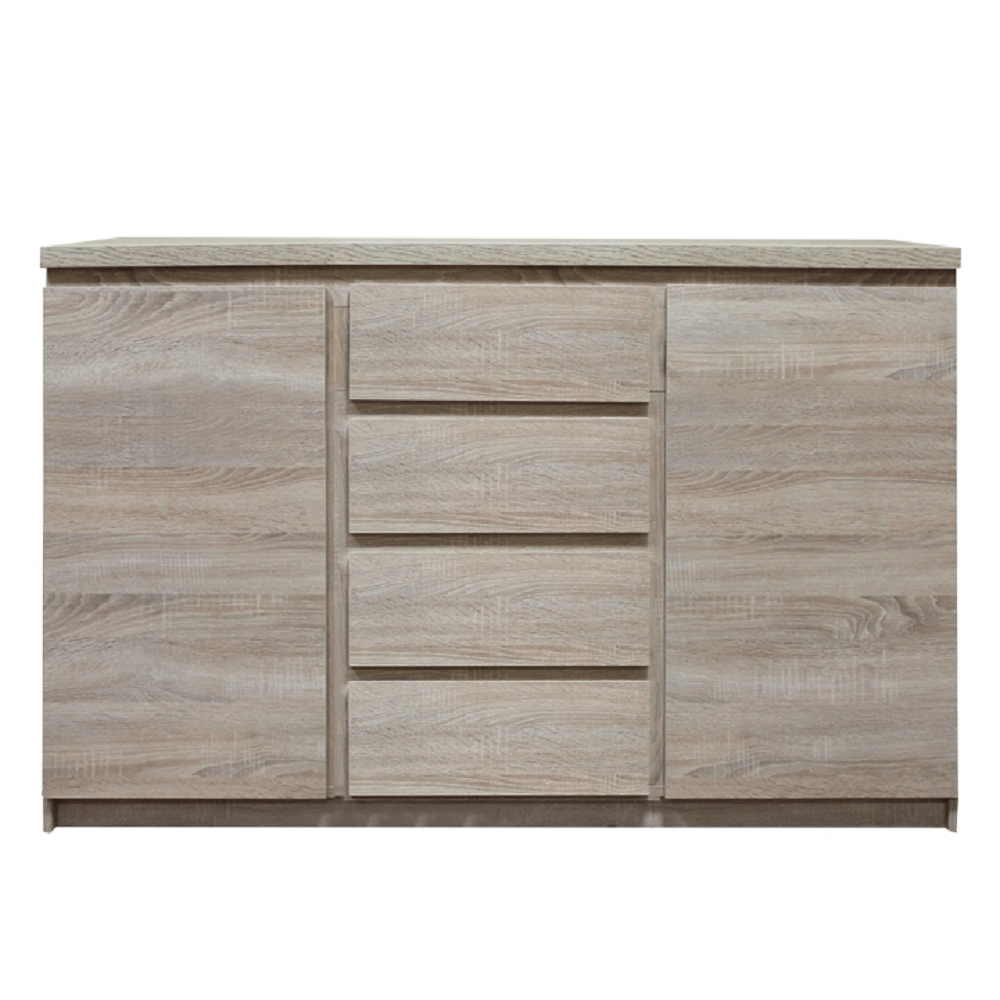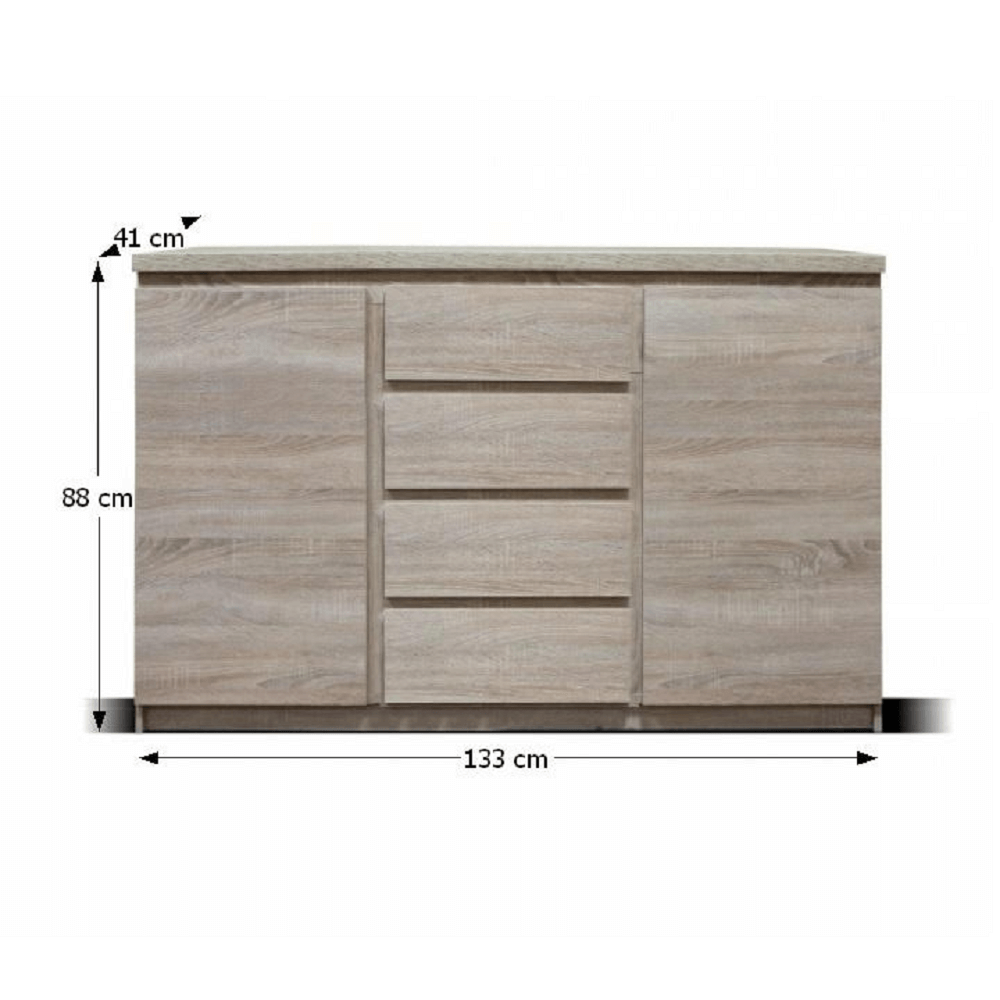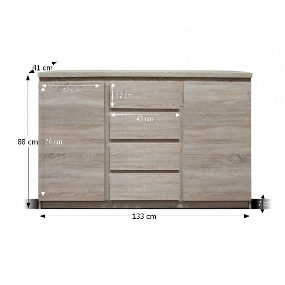 Komoda dvojdverová, štvoršuplíková, TYP 08.Materiál: DTD laminovaná, ABS hrany.Farebné prevedenie: dub sonoma.Rozmery ŠxHxV: 133x41x88 cm.Hrúbka materiálu korpus: 16 mmHrúbka materiálu vrchnej dosky: 25 mm Dodávané v demonte.