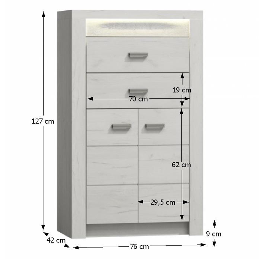 Komoda Infinity I-06 Korpus hrubý až 48 mm, hrúbka materiálu zvyšné časti: 16 mm, úchytky kovovéMateriál DTD laminovaná, ABS hrany, farebné prevedenie: jaseň biely Rozmery ŠxHxV: 76x42x127 cm. Možnosť dokúpenia LED osvetlenia v cene 29 eur. Dodávané v demonte