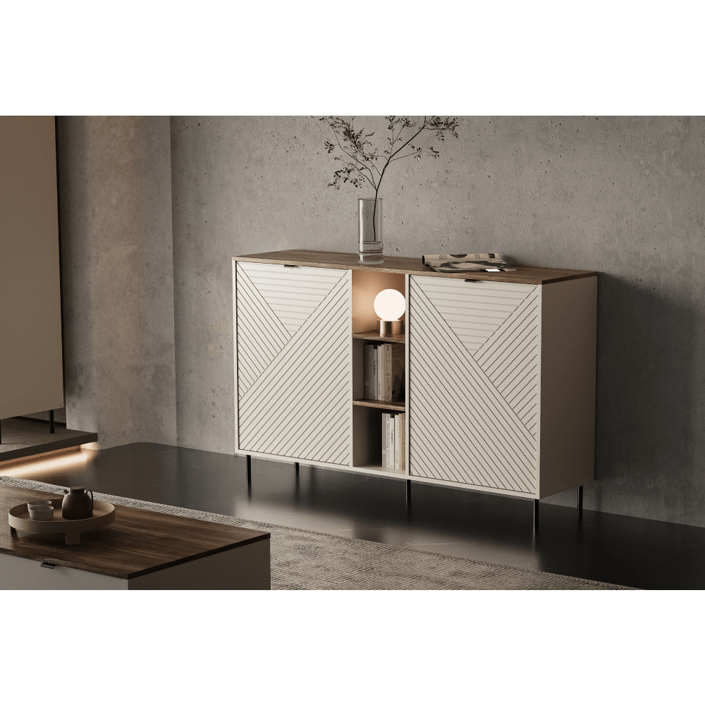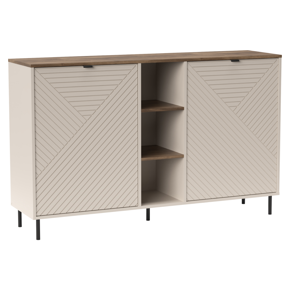 Materiál: laminovaná DTD/MDF/ABS hranyFarba: kašmír/dub castelloRozmery (ŠxHxV): 153,4x40x95,4 cmHrúbka materiálu: 1,6 cmDvojdverováDve skrinkyRozmery skrinka (ŠxV): 59,6x79,7 cmOtvorený úložný priestorPoliceS úchytkamiMateriál úchytiek: kovFarba úchytiek: čiernaNa nožičkáchMateriál nožičiek: kovFarba nožičiek: čiernaVýška nožičiek: 12 cmNosnosť vrchnej dosky: 10 kgNosnosť police: 5 kgDekoratívne dvierkaModerný dizajnOdporúčame pripevniť k steneDodávané v demonte