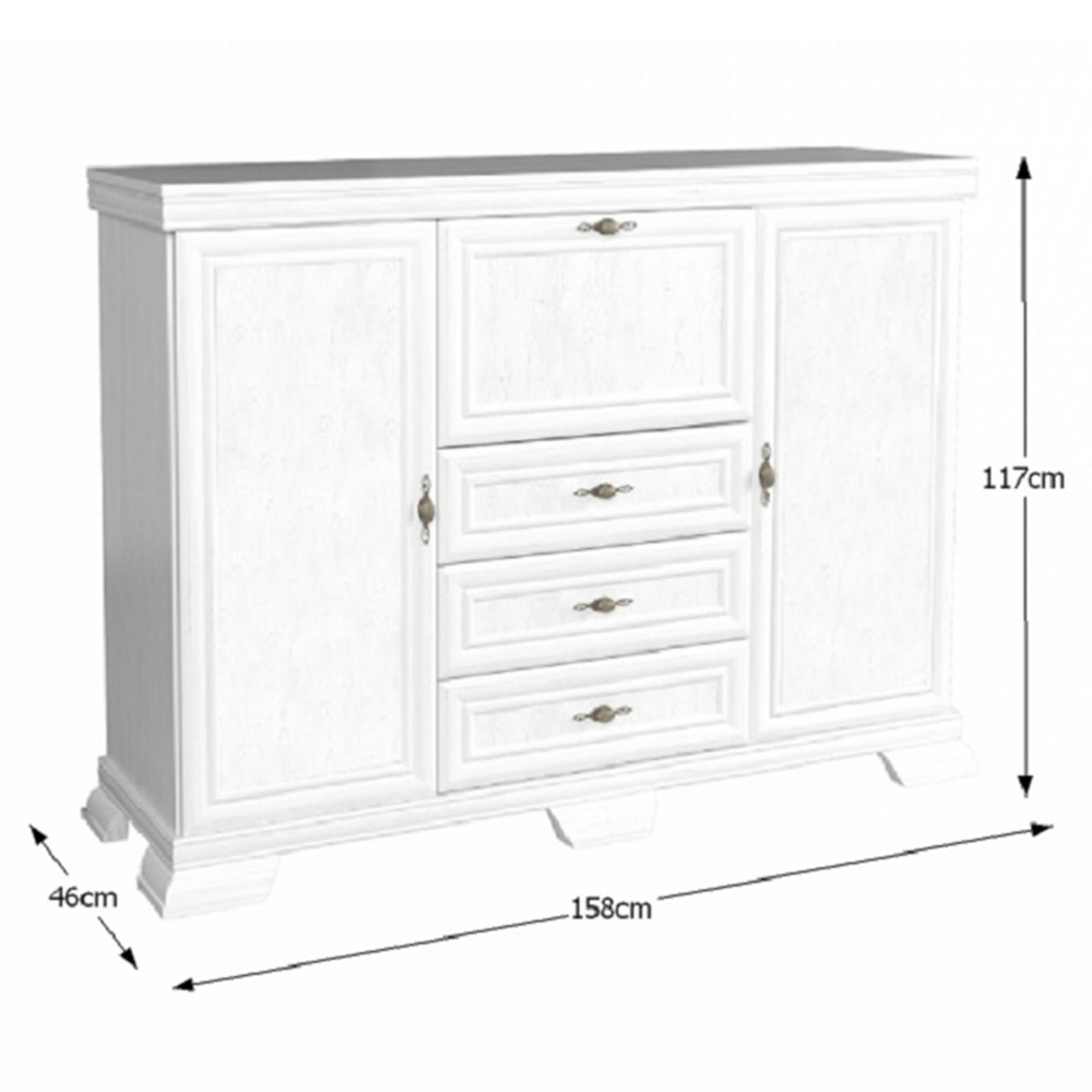 Komoda KORA KK6P NEWMateriál: laminovaná DTD/MDFFarba: sosna andersenRozmery (ŠxHxV): 158x46x117 cmHrúbka materiálu korpus: 15 mmHrúbka materiálu vrchnej dosky: 22 mmHrúbka materiálu dolnej dosky: 22 mmVýška spodného priestoru od podlahy: 10,5 cmRustikálny štýlOzdobné lištyKovové úchytkyTri šuplíkyDve skrinkyBarová skrinkaDodávané v demonte