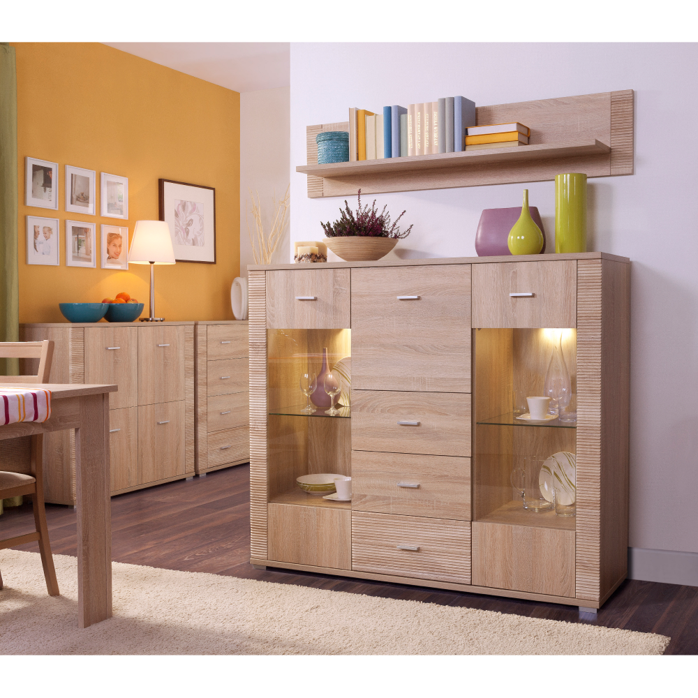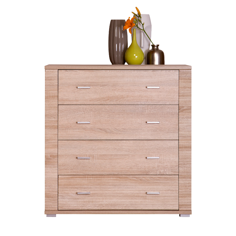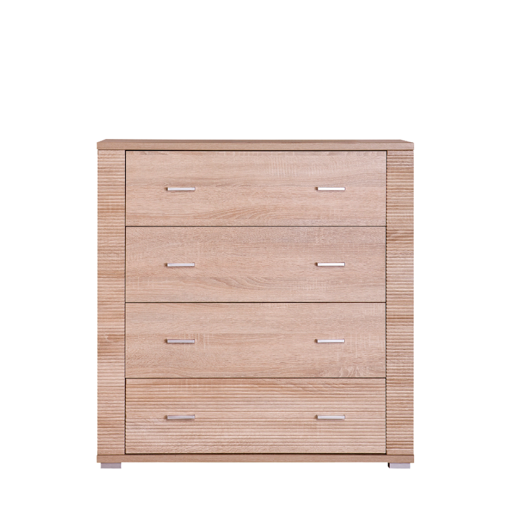 Komoda so 4 zásuvkami typ 11, vhodná na zariadenie obývacích izieb, spální aj pracovní, materiál: DTD laminovaná. Hrany jednotlivých komponentov sú ukončené vrúbkovanou lištou. Farebné prevedenie: dub sonoma. Rozmery (ŠxVxH): 92,8x94x34 cm. Hrúbka materiálu korpus: 16 mmHrúbka materiálu vrchnej dosky: 22 mmHrúbka materiálu spodnej dosky: 22 mmDodávaná v demonte,