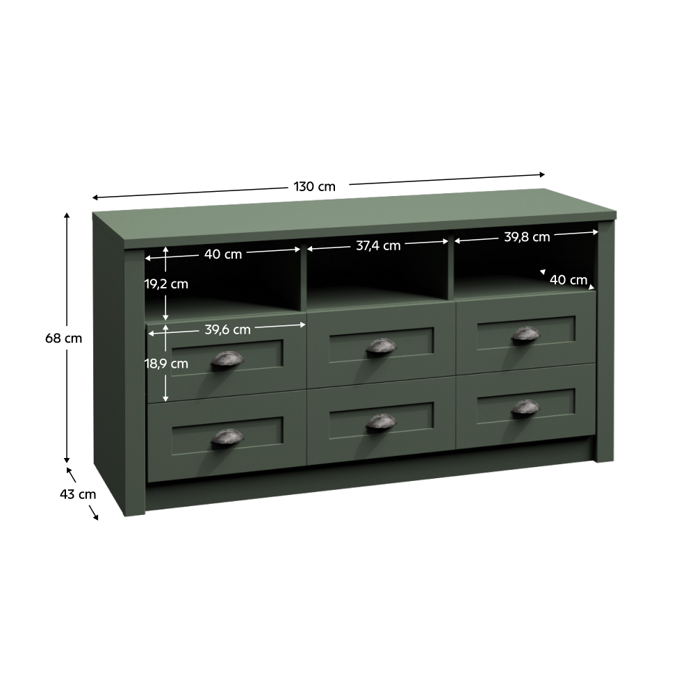 Materiál: DTD laminovanáFarba: zelenáRozmery (ŠxHxV): 130x43x68 cmHrúbka materiálu korpus: 15 mmHrúbka materiálu vrchnej dosky: 22 mm So šuplíkmiOtvorený úložný priestorDodávané v demonte.