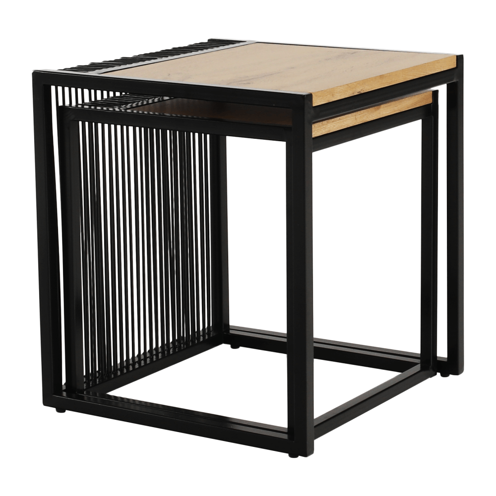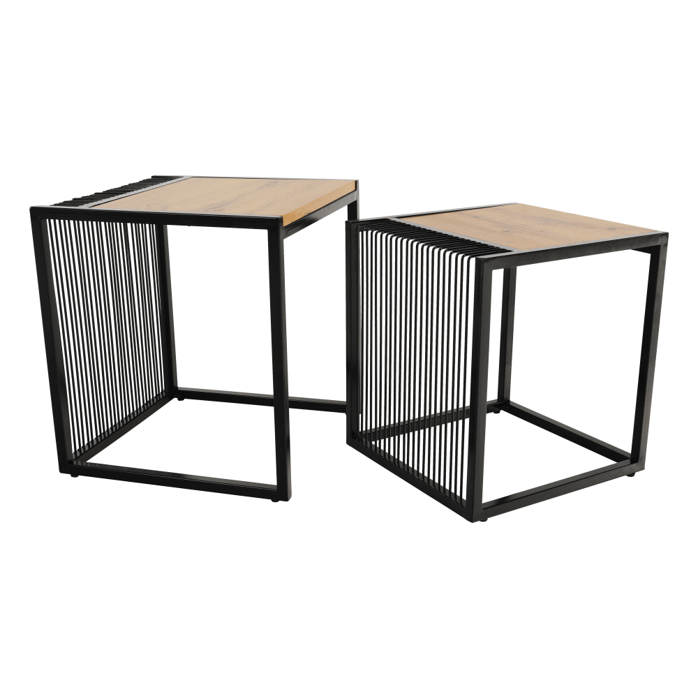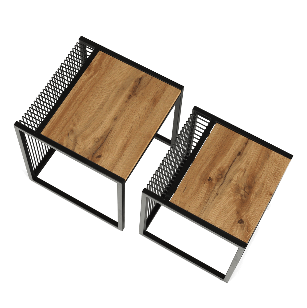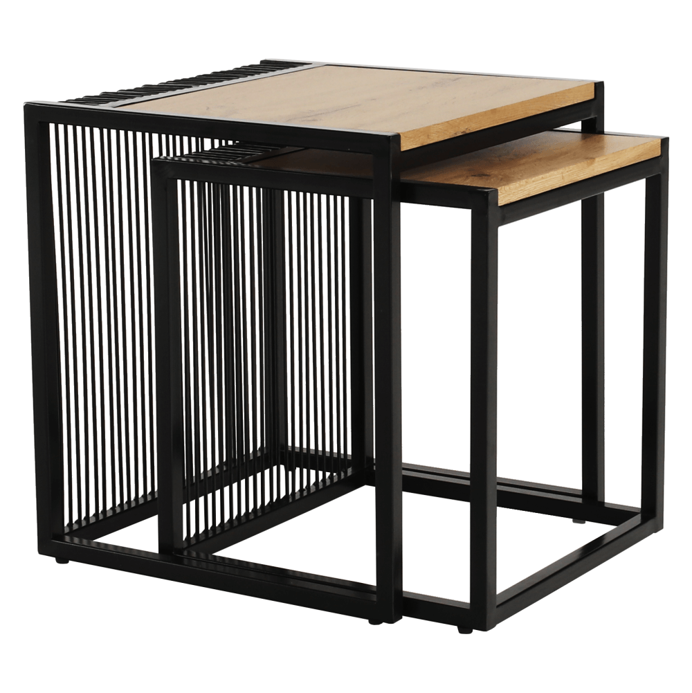 Set dvoch konferenčných stolíkov RIMBOMateriál: MDF/kovFarebné prevedenie: dub/čierny kovRozmery väčší (ŠxHxV): 45x45x50 cmRozmery menší (ŠxHxV): 40x40x45 cmDodávané v demonte.