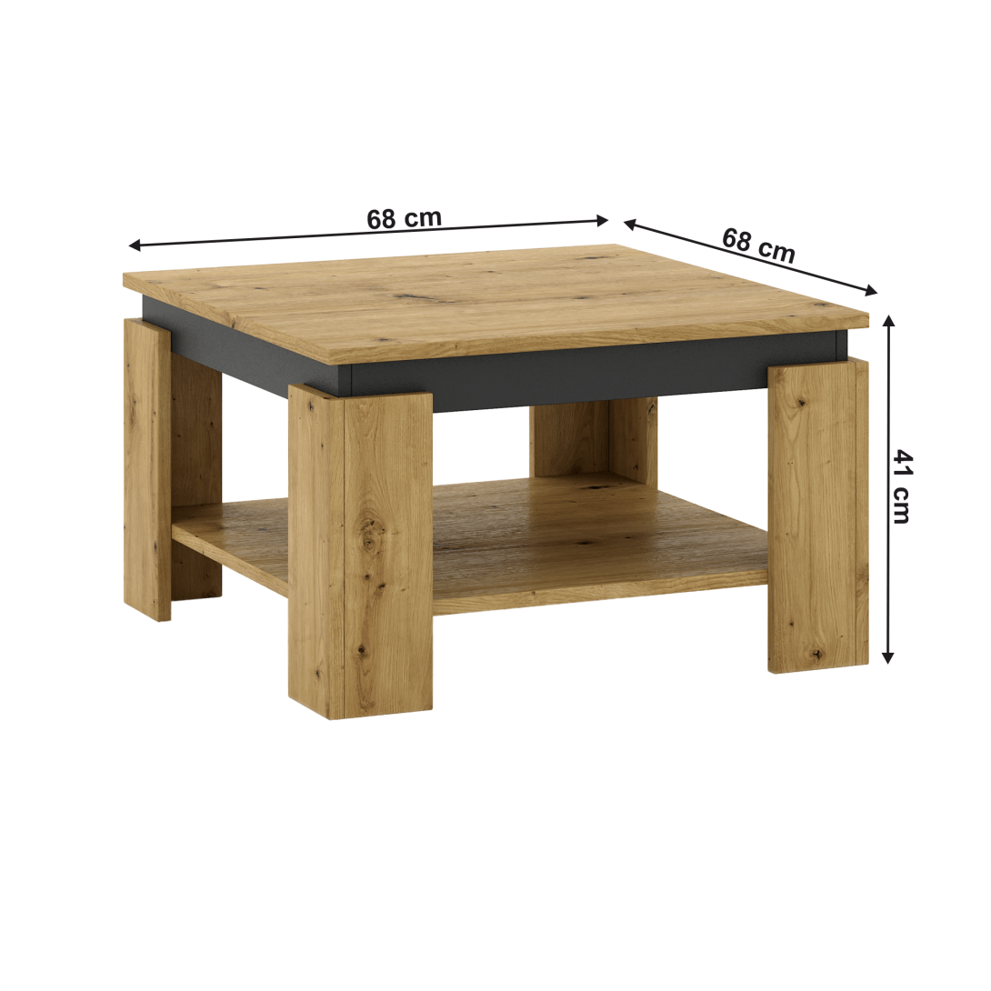 Materiál: laminovaná DTD/ABS hranyFarba: dub artisan/grafitRozmery (ŠxHxV): 68x68x41 cmHrúbka materiálu 1,6 - 1,8 cmNosnosť vrchnej dosky: 15 kgNosnosť odkladacieho priestoru: 15 kgDodávané v demonte