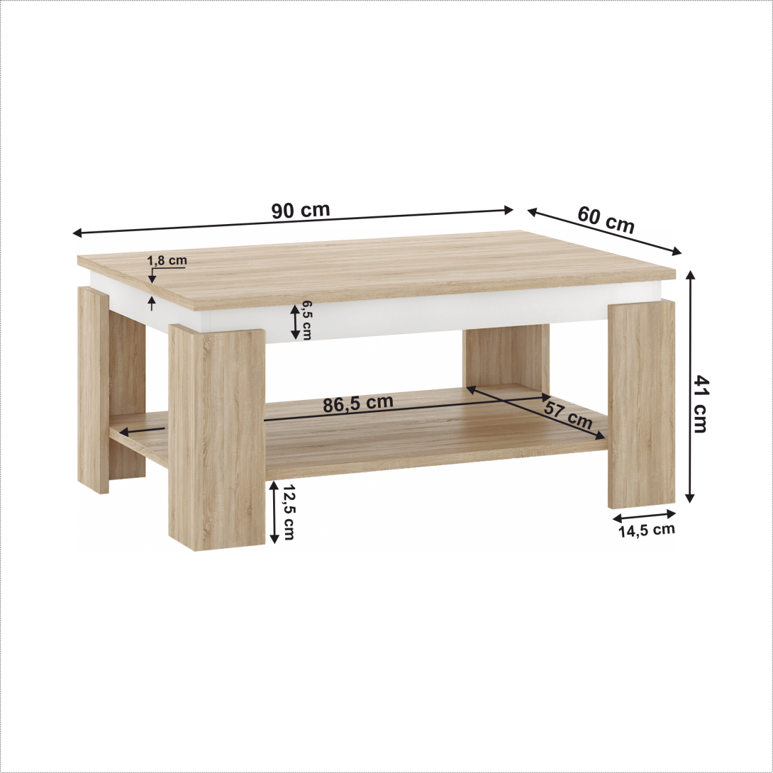 Materiál: DTD laminovaná/ABS hranyFarba: dub sonoma/bielaRozmery (ŠxHxV): 90x60x41 cmS odkladacím priestoromRozmery odkladacieho priestoru (ŠxH): 86,5x57 cmHrúbka vrchného platu: 1,8 cmHrúbka korpusu: 1,6 cmNosnosť: max. 15 kgVýška spodného priestoru od podlahy: 12,5 cmDodávaný v demonte