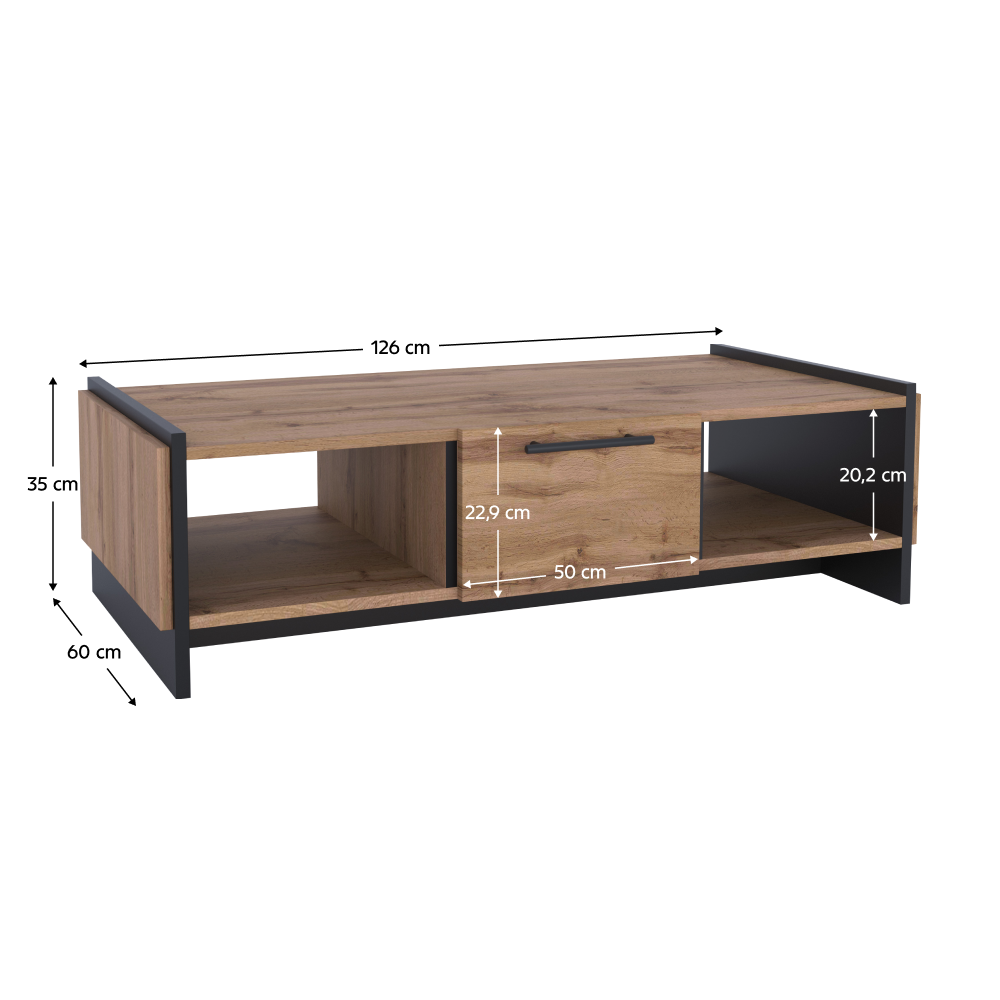 Materiál: DTD laminovaná/ABS hranyFarba: dub wotan/čiernaRozmery (ŠxHxV): 126x60x35 cmHrúbka materiálu: 1,6 cmKovové úchytkyFarba úchytiek: čiernaOtvorený úložný priestorVýška otvoreného úložného priestoru: 20,2 cmNosnosť police: 5 kgŠuplíkRozmery šuplíka (ŠxV): 50x22,9 cmNosnosť šuplíka: 5 kgNosnosť vrchnej dosky: 5 kgDvojitá laminovaná DTDPlastové nožičkyModerný dizajnOdporúčame pripevniť k steneDodávané v demonte