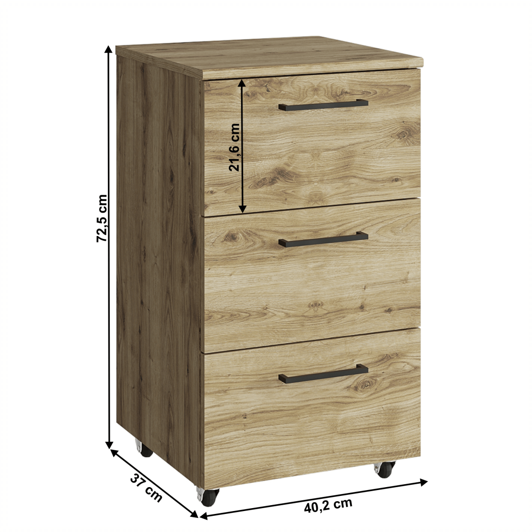 Kontajner DORSI 3SMateriál: DTD laminovaná/MDFFarba: dub navarraRozmery (ŠxHxV): 40,2x37x72,5 cmHrúbka materiálu: 1,6 cmTri šuplíkyNa kolieskachNosnosť: 5 kgPlastové úchytkyFarba úchytiek: čiernaModerný dizajnDodávané v demonte
