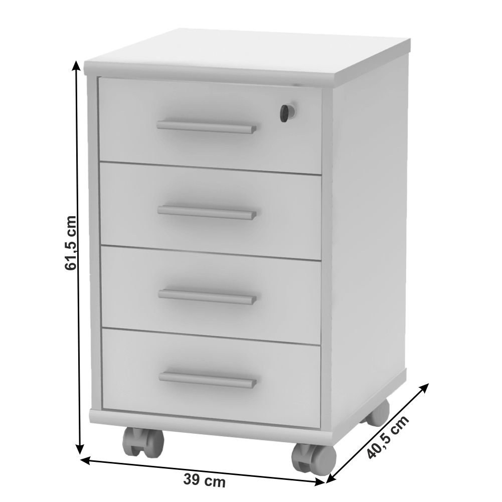 Kancelársky kontajner JOHAN 2 NEW 12 so zámkom a štyrmi šuplíkmiFarebné prevedenie: bielaMateriál: DTD lamiovaná/ABS hranyRozmery (ŠxHxV): 39x40,5x61,5 cm Hrúbka materiálu: 16/22 mm Slovenský výrobokDodávané v demonte