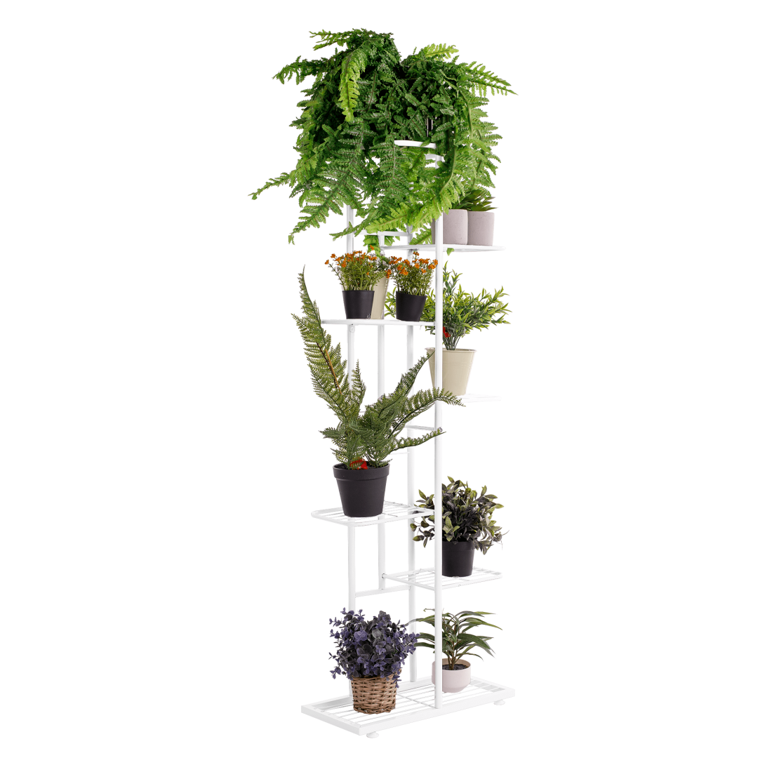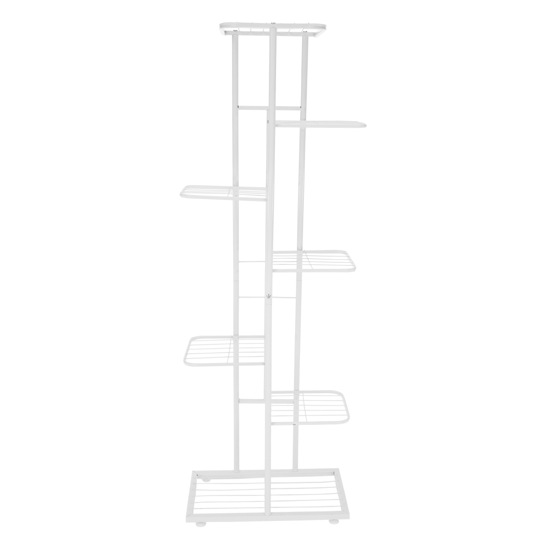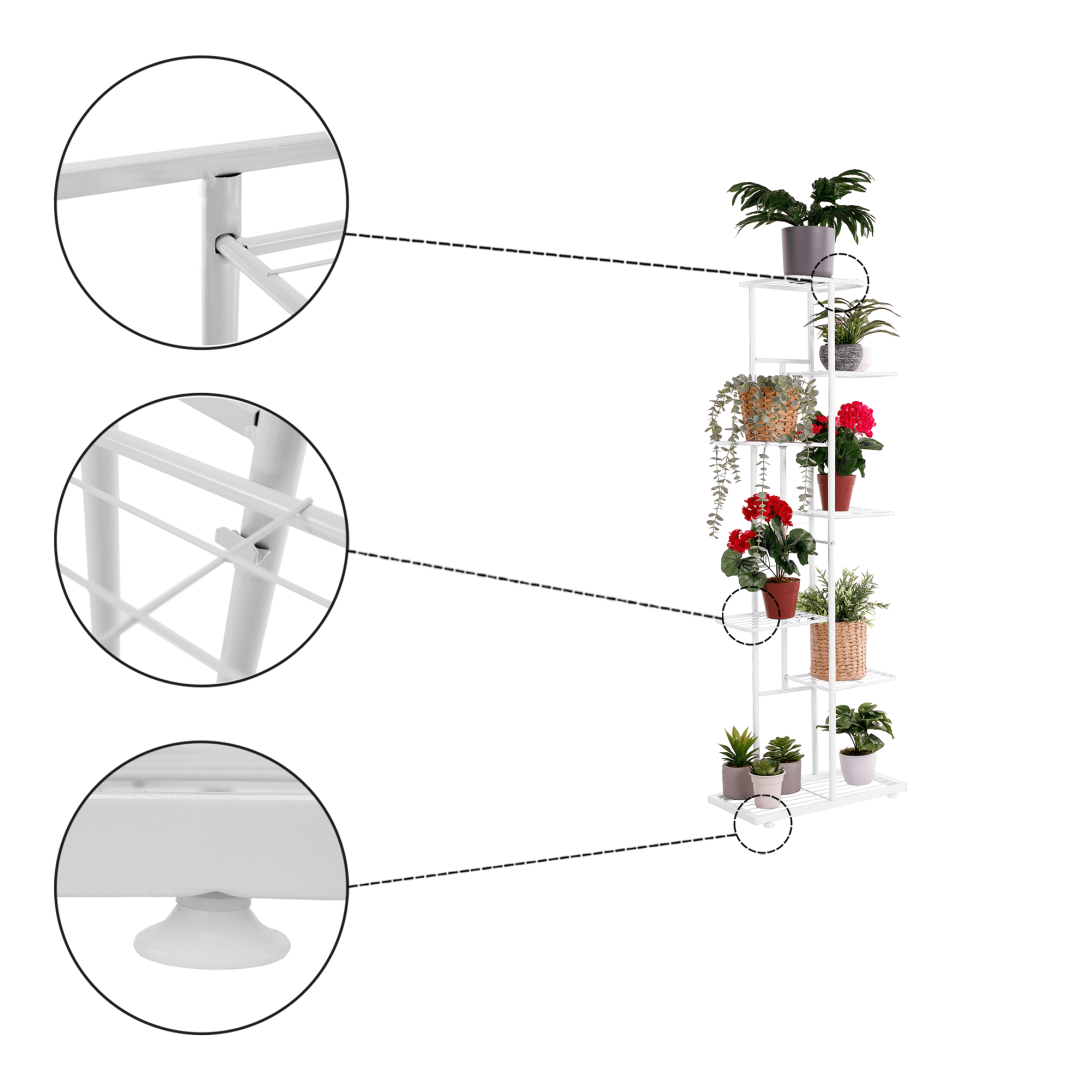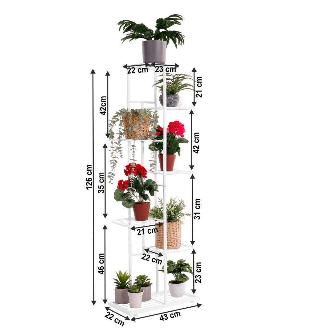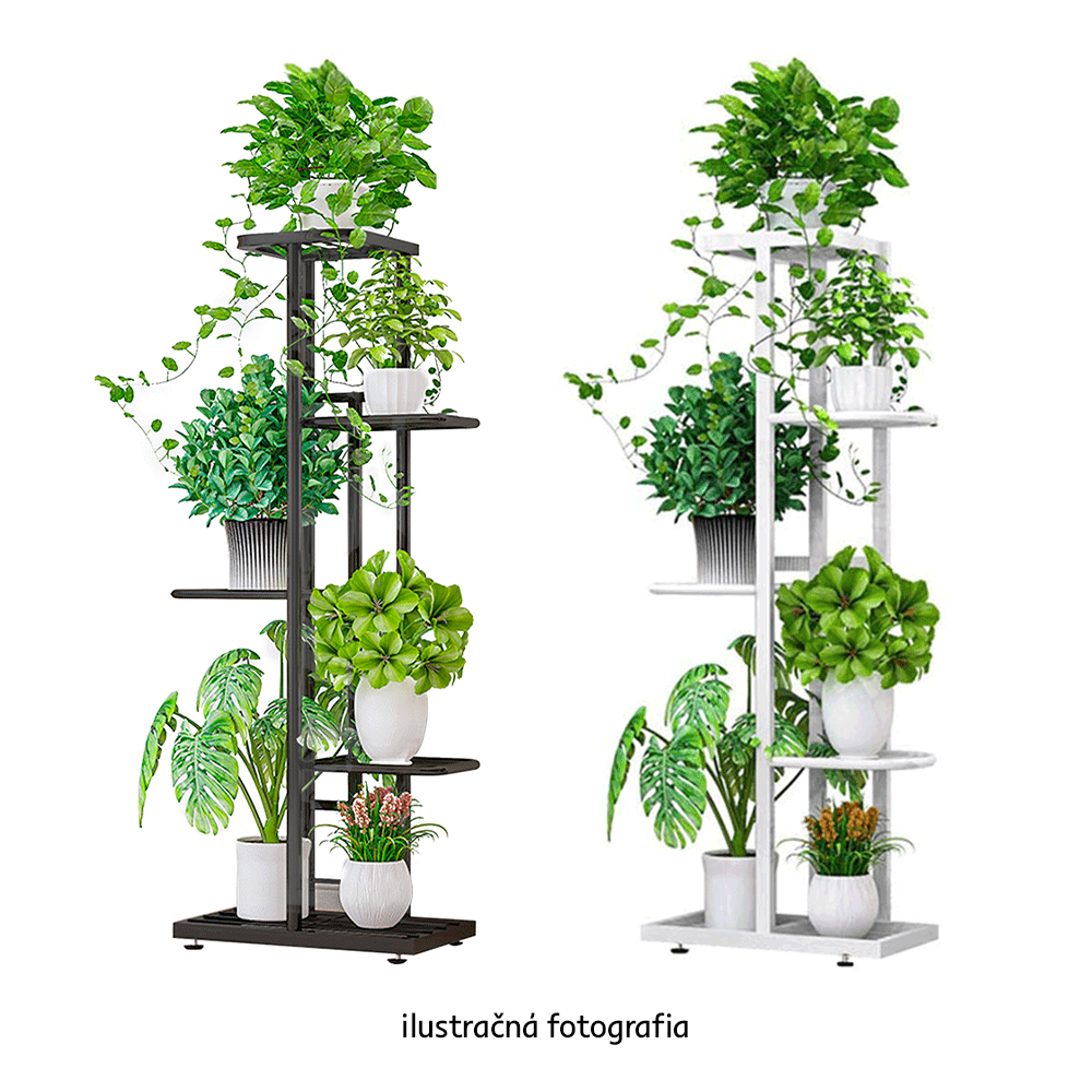 Materiál: kovFarba: bielaRozmery (ŠxHxV): 43x22x126 cmNosnosť na jednu policu: 2 kgHrúbka tyče: 1,6 cmRozmery police (ŠxH): 21x22 cmVýška spodnej police: 23 cmVýška druhej police: 31 cmVýška tretej police: 42 cmVýška hornej police: 21 cmKovová konštrukcia7 polícModerný štýlAko stojan na črepníkové rastlinyNohy zakončené ohybnými klzákmi na vyrovnanie nerovnosti povrchuDodávané v demonte