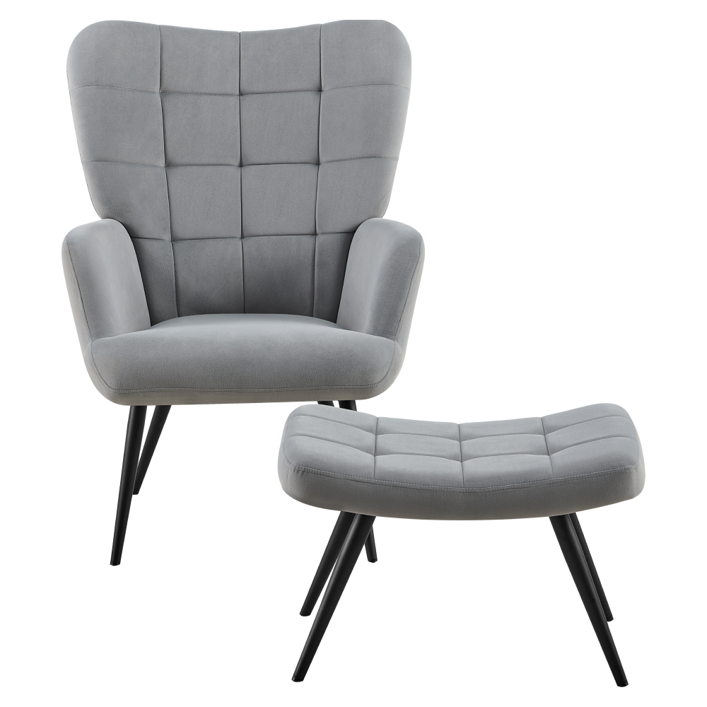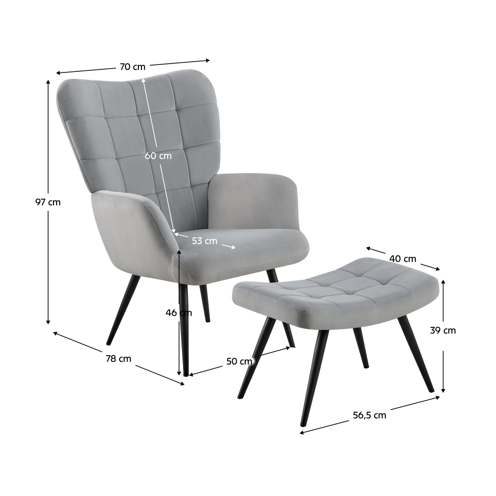 Materiál: látka Velvet 51/kovOderuodolnosť textílie podľa testu Martindale: 95 000 oderovFarebné prevedenie: sivá/čiernaRozmery kresla (ŠxHxV): 70x78x97 cm Výška sedu: 46 cmHĺbka sedu: 53 cmRozmery podnože (ŠxHxV): 56,5x40x39 cmNožičky na podnožke sú výškovo nastaviteľnéNosnosť kresla: 90 kgNosnosť podnože: 80 kgDodávané v demonte