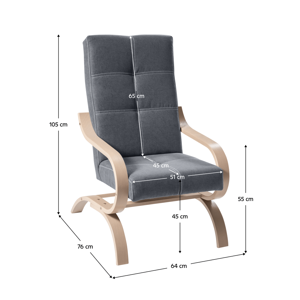 Materiál: látka Twist 20/drevoOderuodolnosť textílie podľa testu Martindale: 45 000 oderovFarba: siváRozmery (ŠxHxV): 64x76x105 cmŠírka sedu: 51 cmHĺbka sedu: 45 cmVýška sedu: 45 cmVýška chrbtovej opierky: 65 cmDrevená konštrukciaFarba konštrukcie: bukBiele prešitieVýplň: pur penaNosnosť na osobu: 90 kgPraktickýModernýKlasický štýlDodávaný v demonte