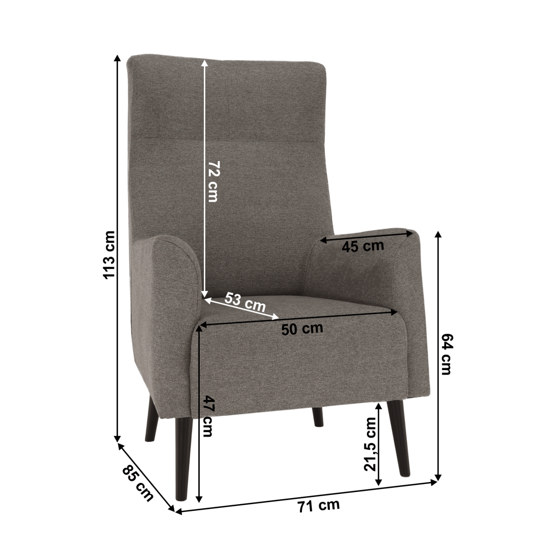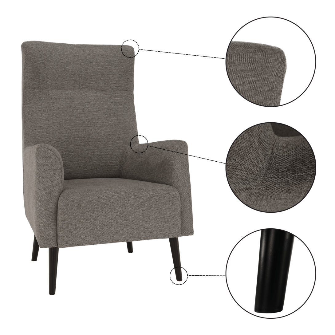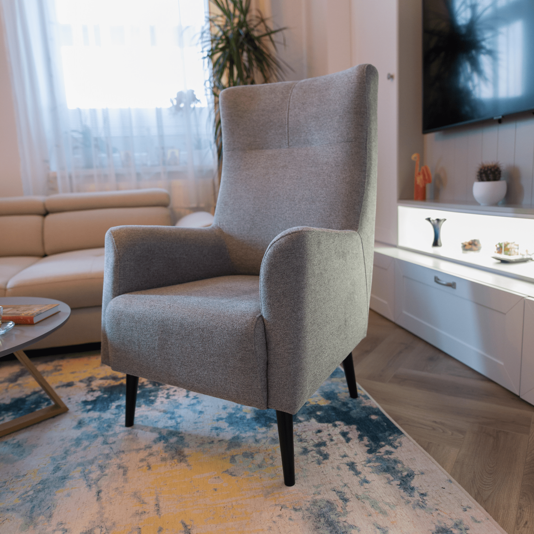 Materiál: látka Matana 03/drevo Oderuodolnosť textílie podľa testu Martindale: 57 000 oderov Farba: sivá/čierna Rozmery kresla (ŠxHxV): 71x85x113 cmVýška spodného priestoru od podlahy: 21,5 cm Výška sedu: 47 cm Hĺbka sedu: 53 cm Šírka sedu: 50 cmVýška od zeme po opierku na ruky: 64 cmVýška opierky chrbta: 72 cm Hĺbka opierky na ruku: 45 cm Nosnosť: 120 kg CeločalúnenéVysoké operadlo Dodávané v demonteKreslo si môžete objednať aj v inej farbe. Na výber máte štyri odtiene látky Matana. Odtiene nájdete v priloženom vzorkovníku. Výber farebného odtieňa poznačte pri objednávaní priamo do poznámky. Pri individuálnej objednávke je potrebné zaplatiť 10% zálohu z danej sumy. Po uhradení zálohy bude Vaša požiadavka zadaná do výroby. Dodacia doba 6-8 týždňov.