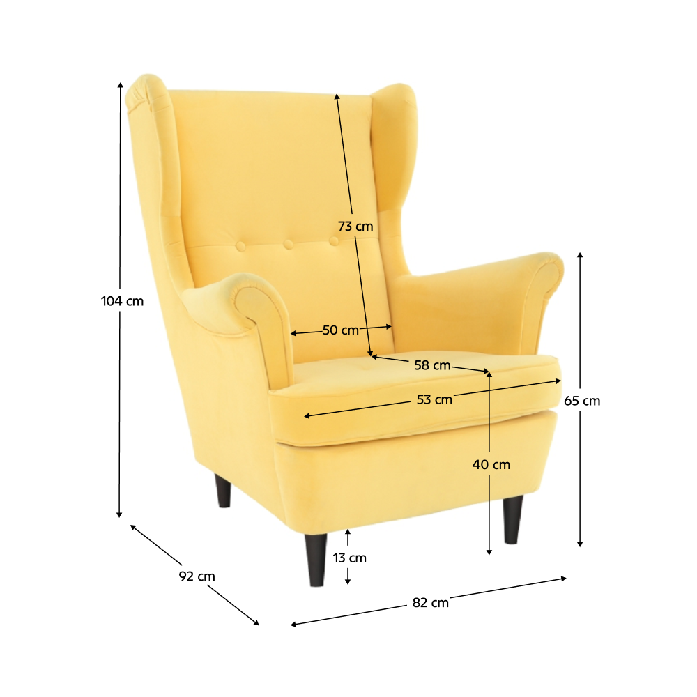 Materiál čalúnenie: látka TrinityOderuodolnosť textílie podľa testu Martindale: 55 000 oderovFarba čalúnenie: žltá 18Materiál nohy: drevoFarba nohy: wengeRozmery kresla (ŠxHxV):82x92x104 cmVýška sedu: 40 cmHĺbka sedu: 58 cmVýška spodného priestoru od podlahy: 13 cmŠírka sedacej časti: 53 cmVýška chrbtovej opierky: 73 cmVýška od zeme po opierku na ruky: 65 cmNosnosť: 120 kgDrevené nožičkyDodávané v demonte