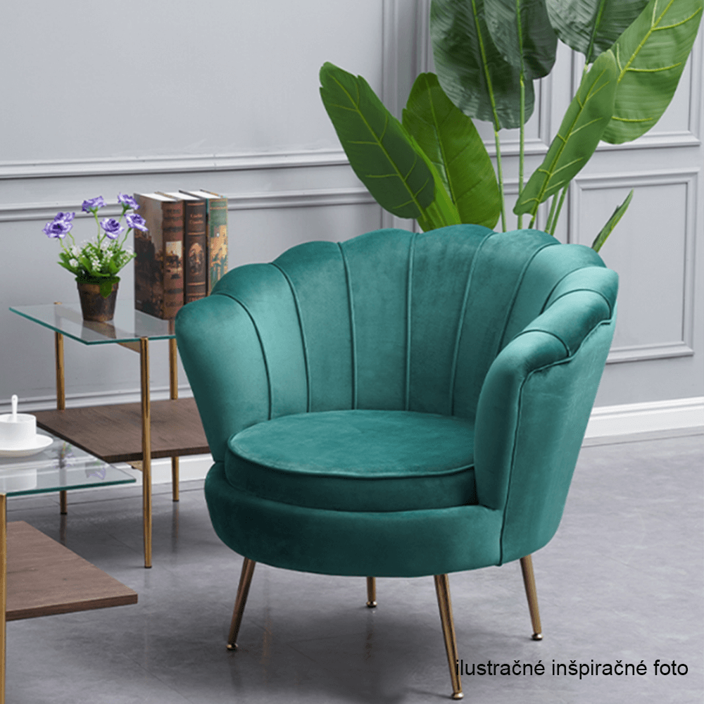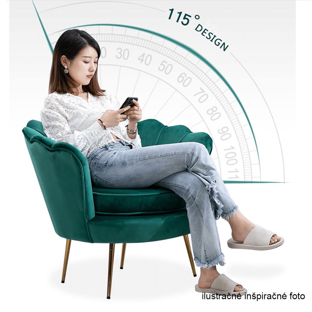 Materiál sedadlo: látka VelvetOderuodolnosť textílie podľa testu Martindale: 80 000 oderovFarba: smaragdová 18Materiál nohy: kovFarba: gold chróm-zlatýRozmery (ŠxHxV): 77x76x77 cmVýška sedu: 46 cmHĺbka sedu: 58 cmNosnosť: 90 kgNohy zakončené ohybnými klzákmi na vyrovnanie nerovnosti povrchuDizajnovéV štýle Art-decoV tvare mušleModerne spracovanéDodávané v demonte