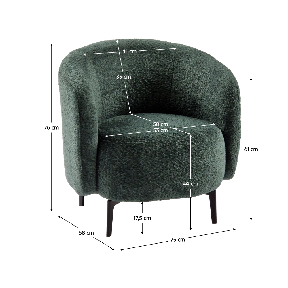 Materiál: látka Abriamo Bouclé 09Oderuodolnosť látky podľa testu Martindale: 45 000 oderovRozmery (ŠxHxV): 75x68x76 cmFarba čalúnenia: zelenáVýplň: pružina falista+ PUR pena T30Materiál nohy: kovFarba nohy: čiernaVýška spodného priestoru od podlahy: 17,5 cmVýška chrbtovej opierky: 35 cmŠírka chrbtovej opierky: 41 cmVýška sedu: 44 cmHĺbka sedu: 50 cmŠírka sedu: 53 cmVýška opierky na ruky: 61 cmNosnosť: 120 kgDizajnovéCeločalúnenéŤažko zápalná textíliaDodávané v demonteMožnosť objednania v 6 farebných prevedeniach látky Abriamo Bouclé v cene 199 Eur. Pri individuálnej objednávke je potrebné zaplatiť 10% zálohu z danej sumy. Po uhradení zálohy bude Vaša požiadavka zadaná do výroby. Doba dodania 6-8 týždňov.