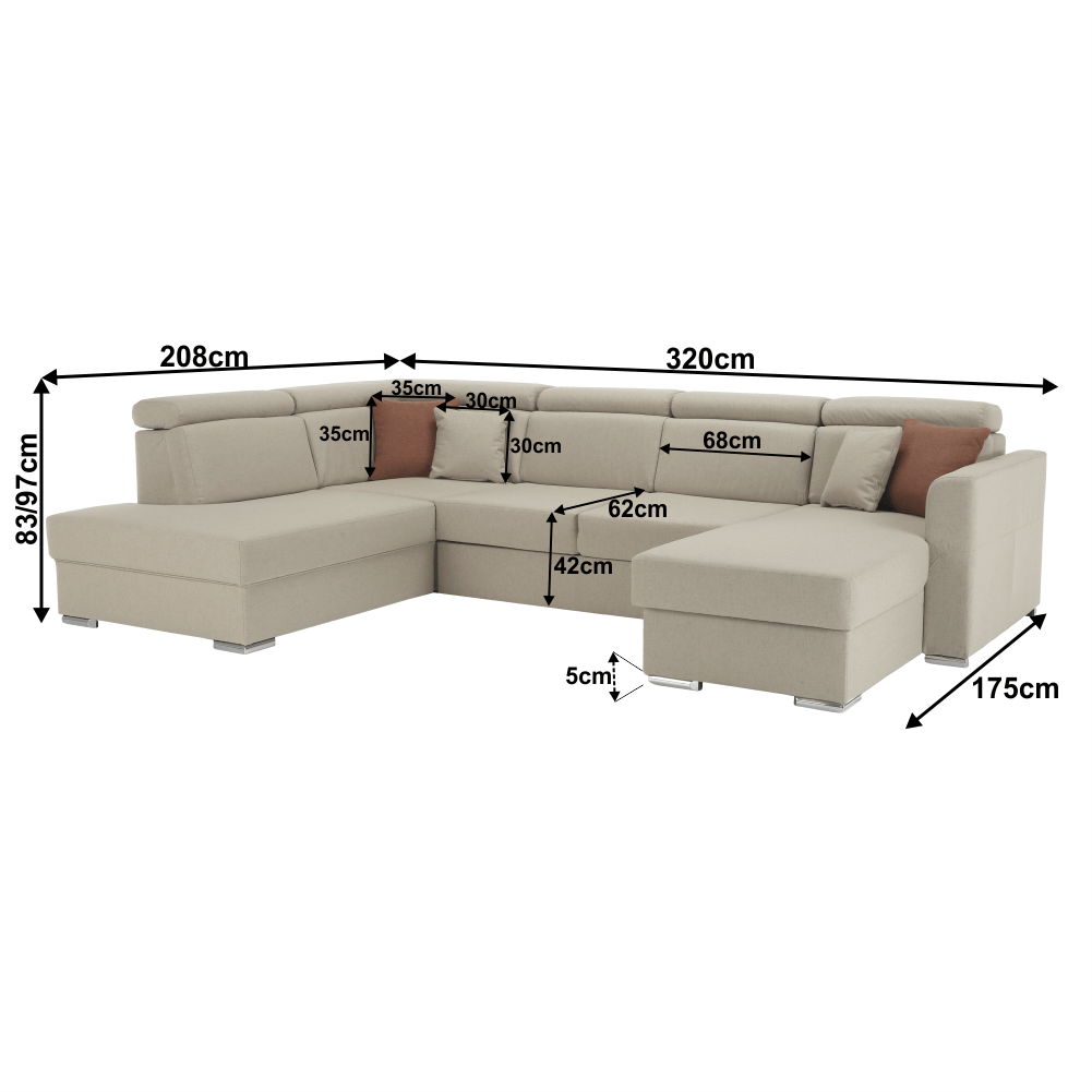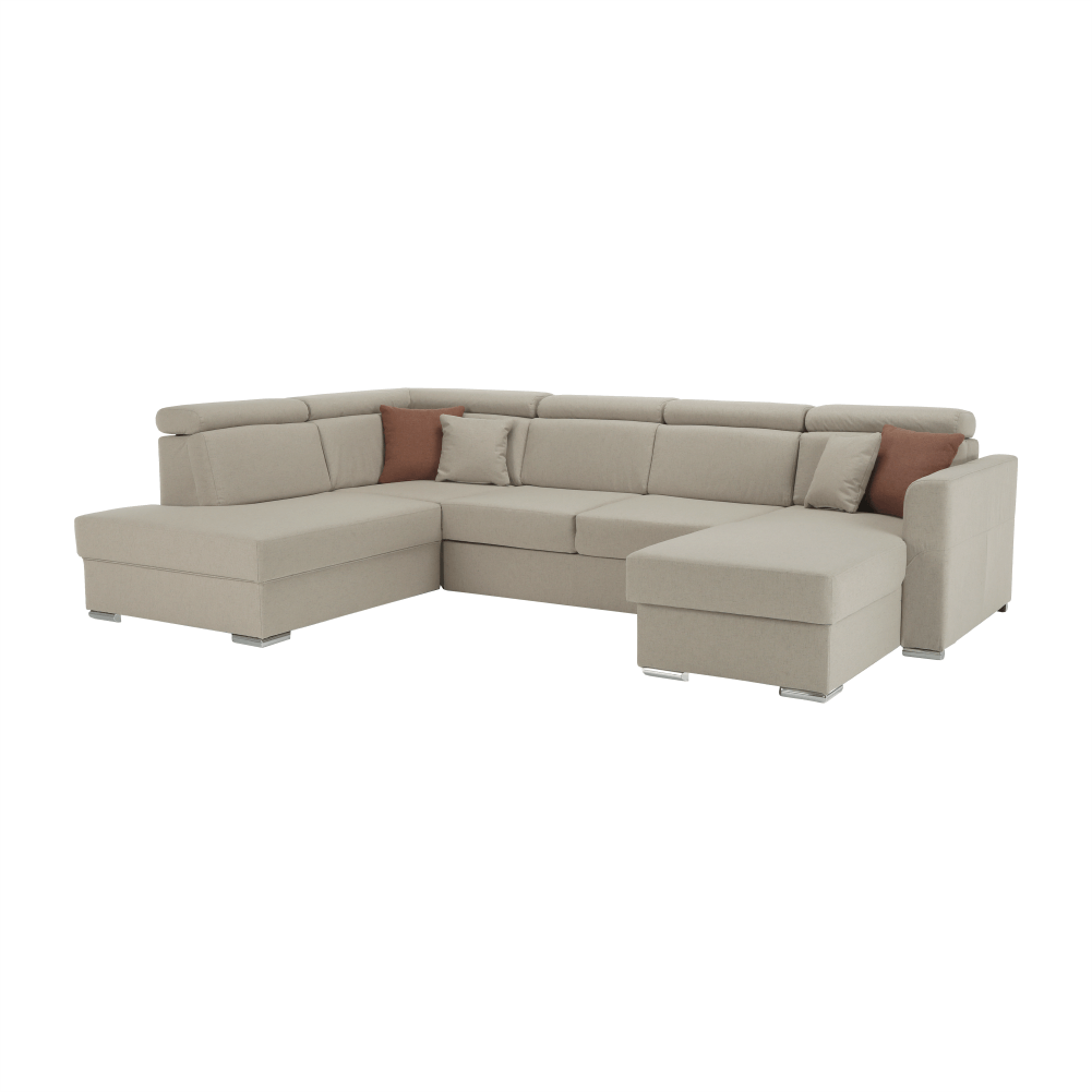 Celočalúnená luxusná sedacia súprava ľavá, s rozkladom a úložným priestorom MARIETA U. Rozmery: (ŠxHxV): 320x208-175x83-97 cm, plocha na spanie (ŠxD): 130x260cm Nosnosť na osobu: 90 kg Výška spodného priestoru od podlahy: 5 cm Materiál: látka CABLO 02/05 Oderuodolnosť textílie podľa testu Martindale: 72 000 oderov Farba: béžová 02/tehlová 05 Opierka chrbta (ŠxV): 68x33/57 cm Menšie vankúše (ŠxV): 30x30 cm Väčšie vankúše (ŠxV): 35x35 cm Dodávané s vankúšmi: 4 ks 4 polohovacie opierky hlavy Dodávané v demonte. Ponúkame vám možnosť zložiť si sedačku vo vlastnom rozmere a podľa vlastných potrieb. Komponenty na zloženie hľadajte v našej ponuke. Máme pre vás hneď sedem farieb látky Cablo a sedem farieb ekokože, kombinovať teda môžete podľa ľubovôle. Odtiene nájdete v priloženom vzorkovníku. Výber farebného odtieňa poznačte pri objednávaní priamo do poznámky. Pri individuálnej objednávke je potrebné zaplatiť 10% zálohu z danej sumy. Po uhradení zálohy bude Vaša požiadavka zadaná do výroby. Doba dodania 6-8 týždňov. Cena takto zloženej sedačky v inej farbe závisí od počtu jednotlivých dielov, ktoré ju tvoria. Odporúčame preveriť si konečnú cenu.