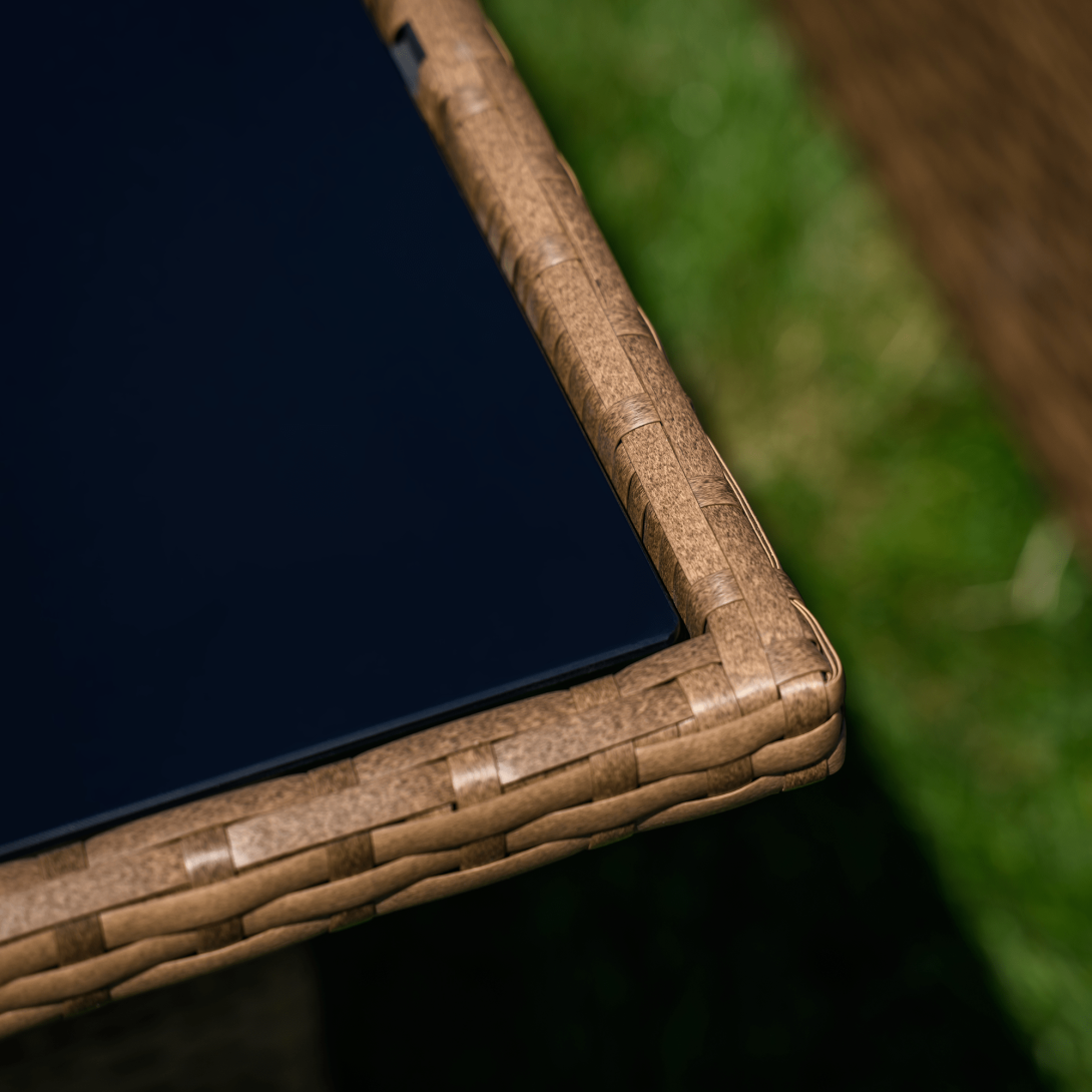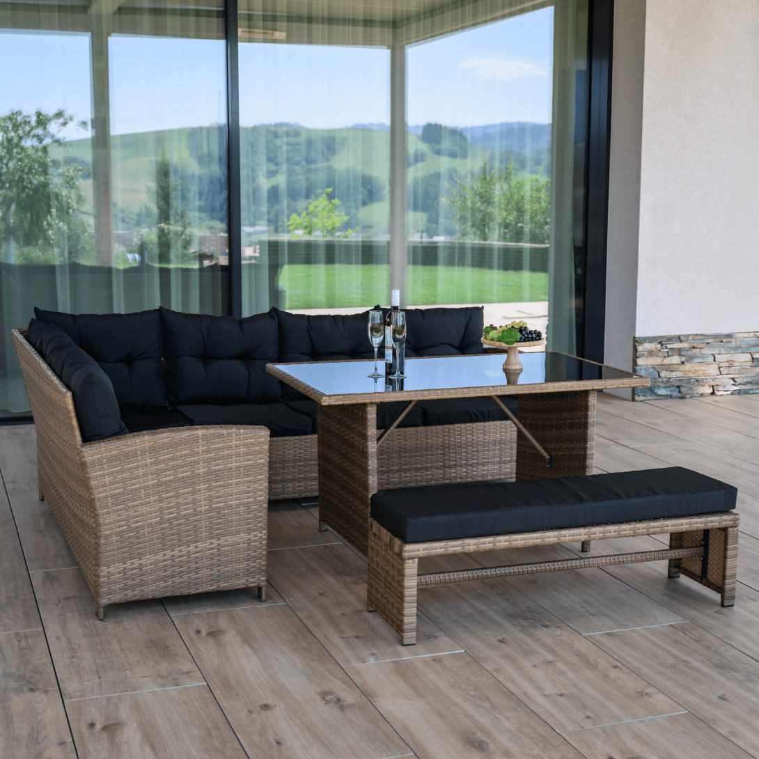 Materiál: technoratan/látka/kov/tvrdené skloOderuodolnosť textílie podľa testu Martindale: 95 000 oderovFarba: svetlohnedá/čiernaRozmery roh (ŠxHxV): 229x174/65x85 cmRozmery stôl (ŠxHxV): 130x75x68 cmRozmery lavica (ŠxHxV): 120x35x39 cmVýška sedu: 40 cmHĺbka sedu: 40 cmVýška chrbtovej opierky: 35 cmNosnosť na osobu: 90 kgNosnosť stola: 35 kgDodávané s vankúšmiHrúbka vankúša: 7 cm3-dielna súpravaRohLavicaJedálenský stôlS tvrdeným sklom (5 mm)Poťah je vodeodolnýDodávané v demonte