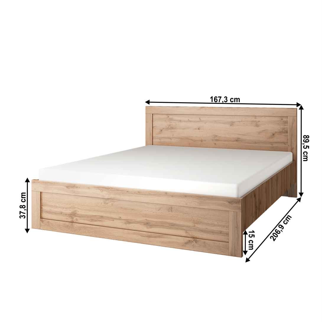Manželská posteľ MORATIZ 160Materiál: DTD laminovanáFarba: dub wotanRozmery (ŠxHxV): 167,3x206,9x89,5 cmHrúbka materiálu: 1,6 - 2,2 cm Odporúčaná minimálna výška matraca: 10 cm Výška od podlahy: 15 cmNosnosť na osobu: 100 kg Bez úložného priestoru S roštomDodávaná je s lamelovým roštom a s kovovým rámomDodávané bez matracaMožnosť dokúpiť matrac z našej ponuky Dodávaná v demonte