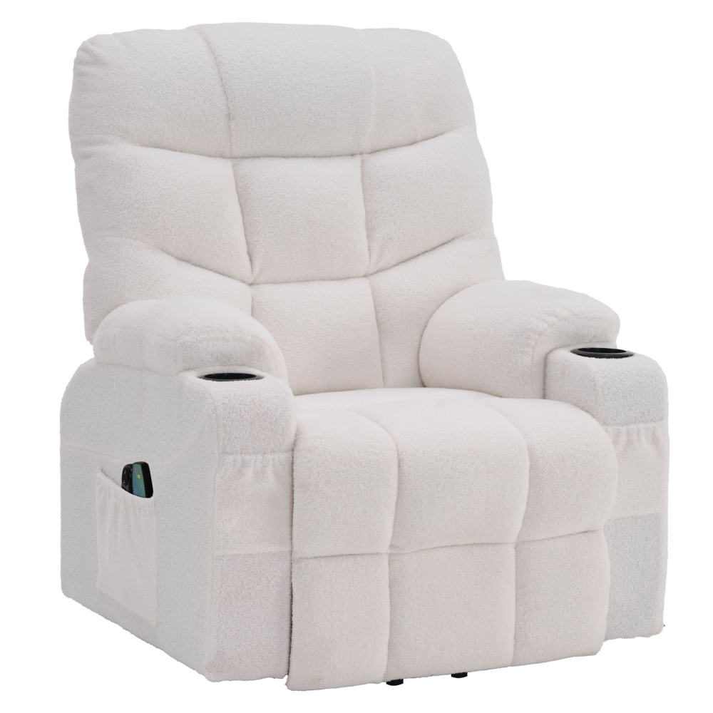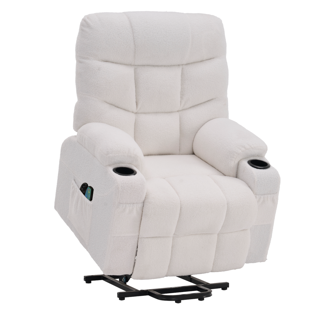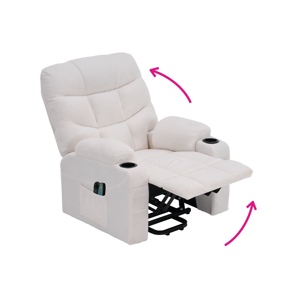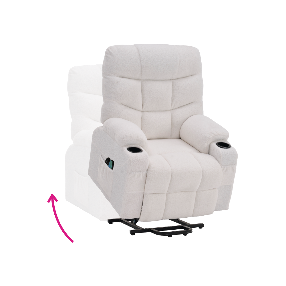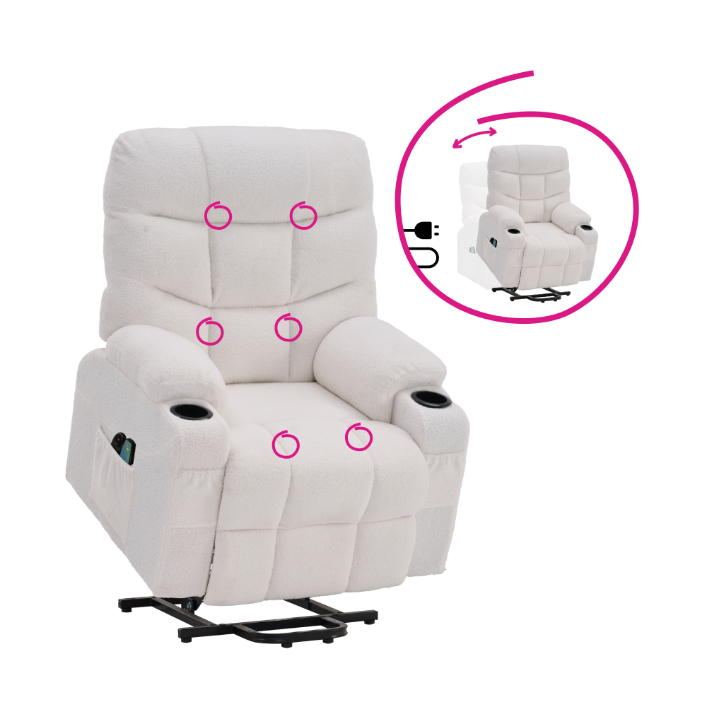 Materiál: oceľ/látka BoucléOderuodolnosť textílie podľa testu Martindale: 45 000 oderovVýplň: pena s vysokou hustotou 240DFarba: bielaRozmery (ŠxHxV): 87x97-155x80-108 cmVýška sedu: 49 cmHĺbka sedu: 56 cmŠírka sedu: 56 cmŠírka chrbta: 79 cmVýška chrbtovej opierky: 70 cmNosnosť: 150 kgPolohovacieRelaxačnéMasážne6 masážnych vibračných bodov8 masážnych metódČasovač 15-30 min3 nastaviteľné úrovne intenzityOdkladací priestorPraktické bočné vreckáElektrická funkcia zdvíhaniaMechanizmus vyklápania podnože a chrbtaZdvíhacie kresloDodávané s diaľkovým ovládanímDĺžka sieťového kábla: 2,5 cmNapätie: 100-240VDodávané v demonte