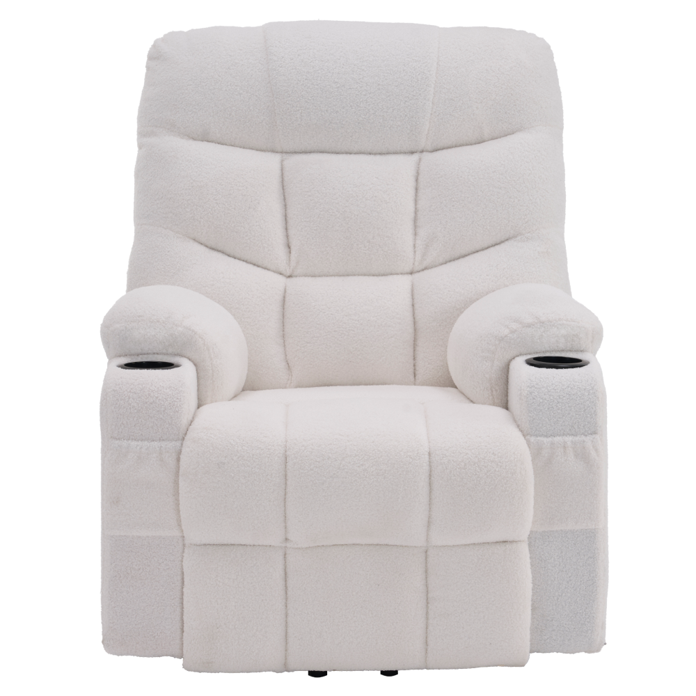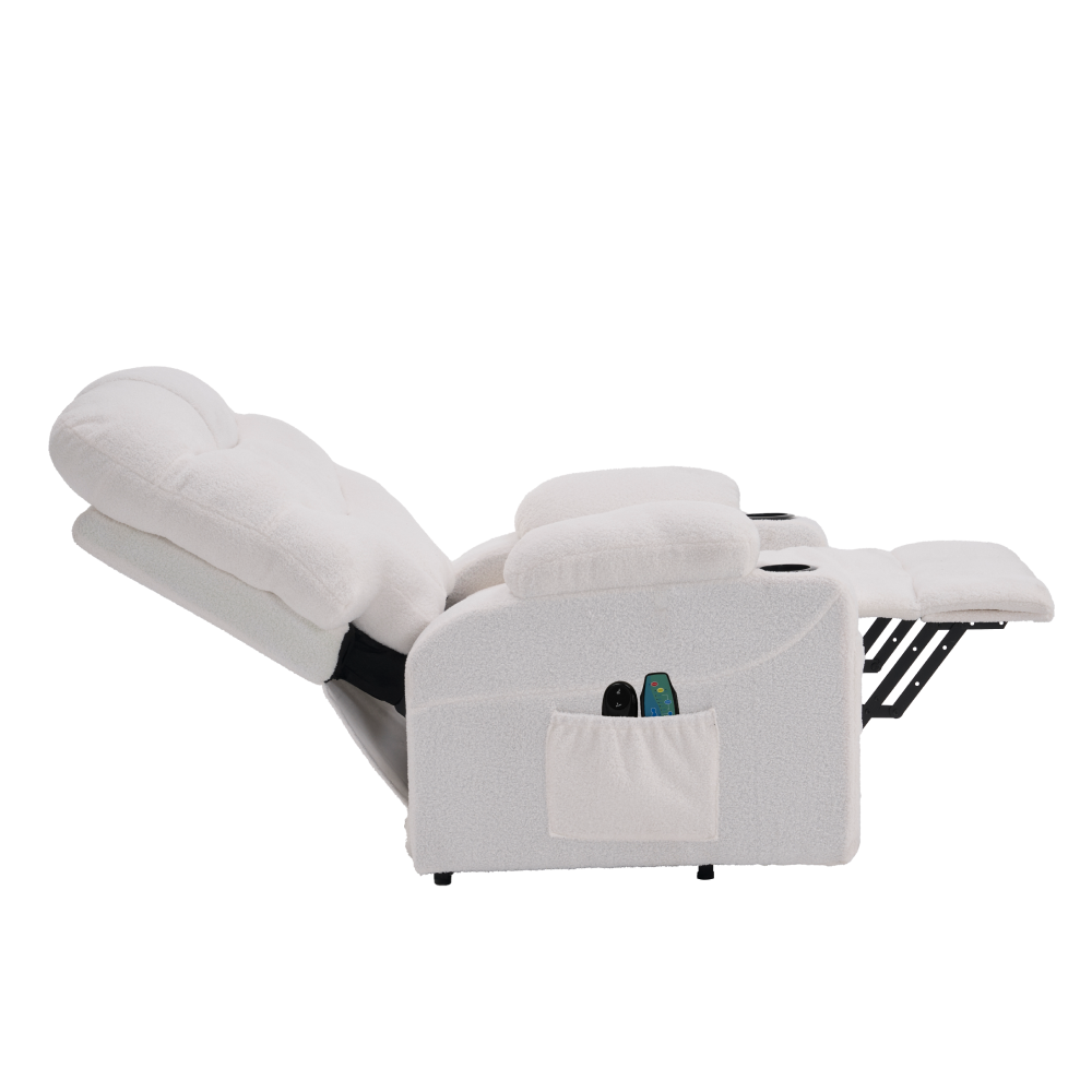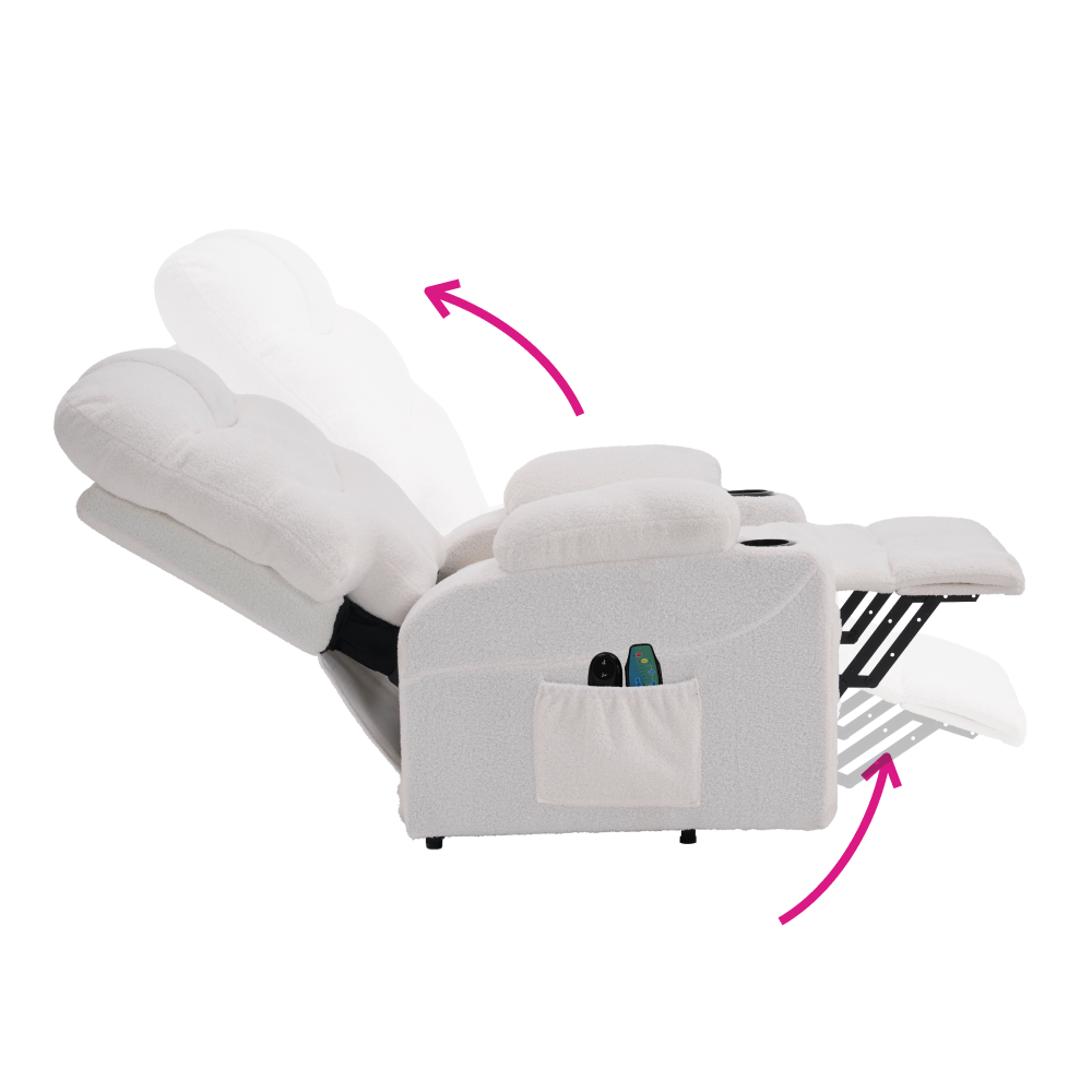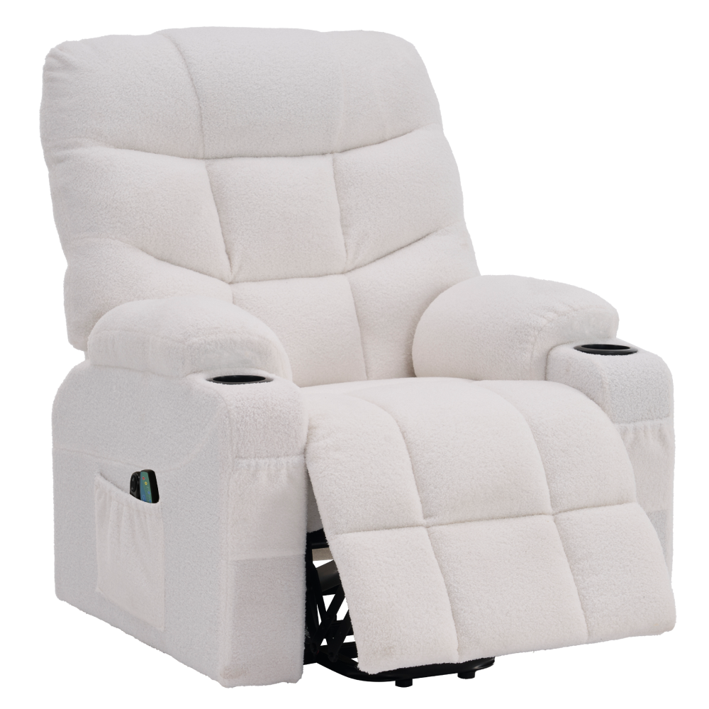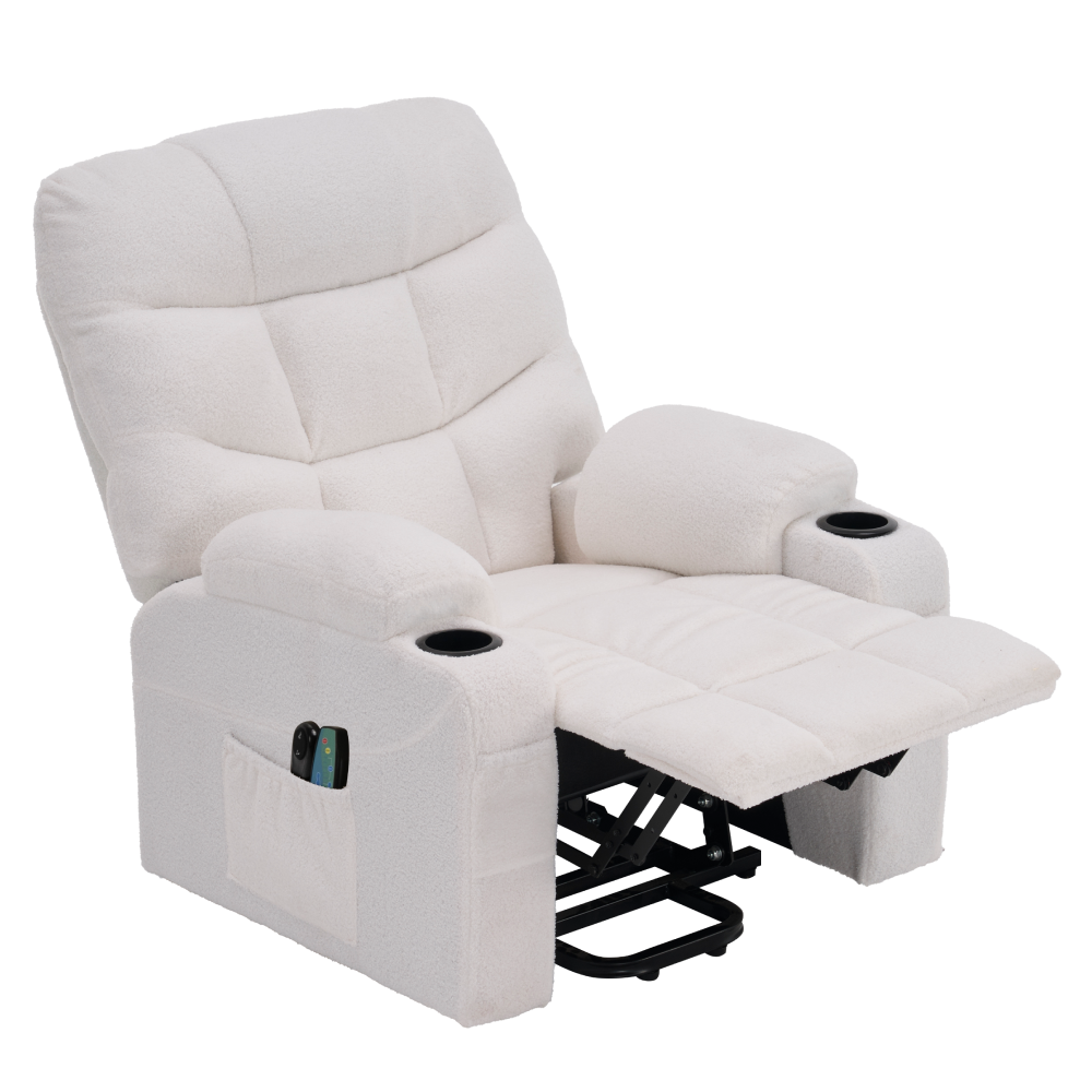 Materiál: oceľ/látka BoucléOderuodolnosť textílie podľa testu Martindale: 45 000 oderovVýplň: pena s vysokou hustotou 240DFarba: bielaRozmery (ŠxHxV): 87x97-155x80-108 cmVýška sedu: 49 cmHĺbka sedu: 56 cmŠírka sedu: 56 cmŠírka chrbta: 79 cmVýška chrbtovej opierky: 70 cmNosnosť: 150 kgPolohovacieRelaxačnéMasážne6 masážnych vibračných bodov8 masážnych metódČasovač 15-30 min3 nastaviteľné úrovne intenzityOdkladací priestorPraktické bočné vreckáElektrická funkcia zdvíhaniaMechanizmus vyklápania podnože a chrbtaZdvíhacie kresloDodávané s diaľkovým ovládanímDĺžka sieťového kábla: 2,5 cmNapätie: 100-240VDodávané v demonte