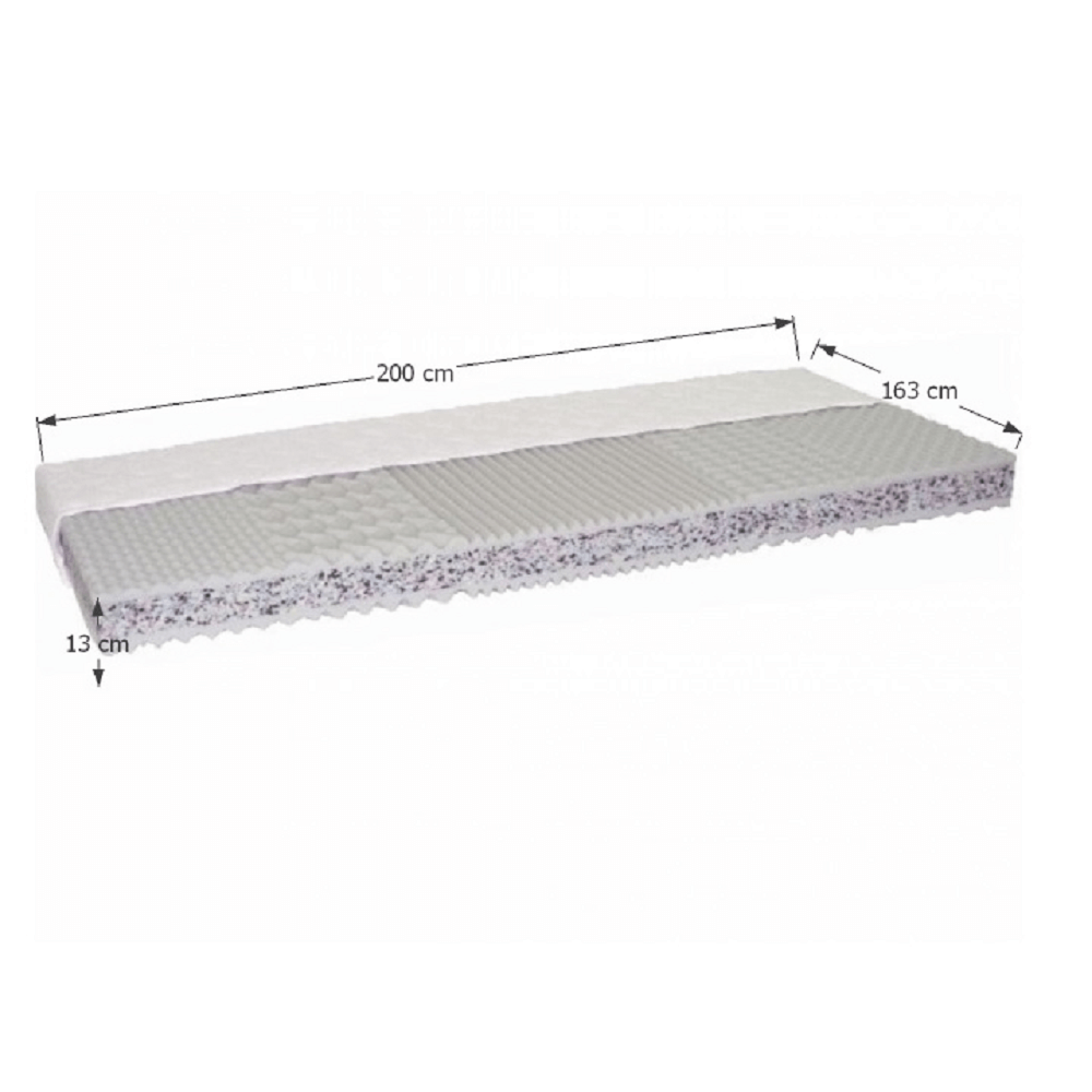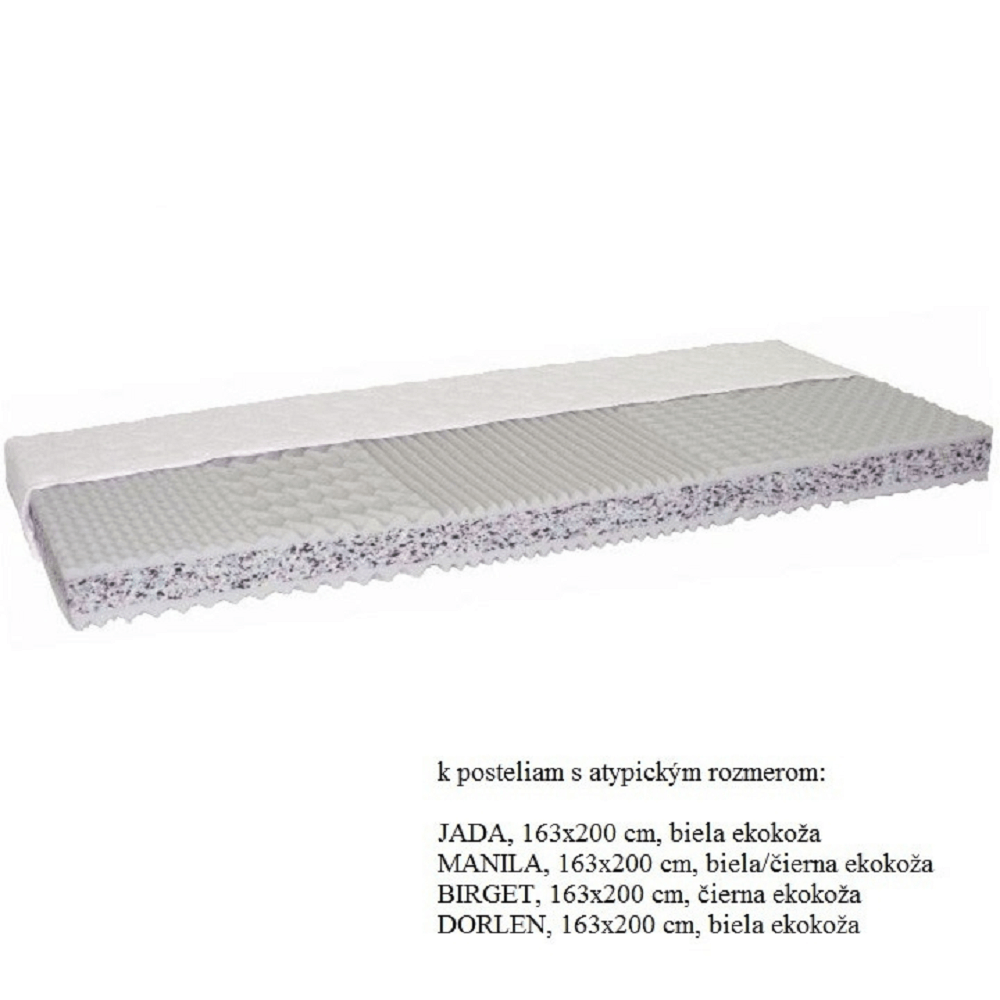 Sendvičový matrac Catania Eco ATYP, 163x200, kombinácia PUR peny a RE peny, poťah SILVER /100% polyester/, ľahko snímateľný, zips po celom obvode, prať pri 60°C. Matrac je v atypickom rozmere 163x200 cm. Nosnosť: cca 110 kg. Ideálny rozostup medzi latami/lamelami je 2-3 cm Tvrdosť matraca: tvrdý T4 Je špeciálne vyrobený k posteliam s takýmto vnútorným rozmerom. Matrac odporúčame k posteliam:posteľ JADA, 160x200 cm, ekokoža bielaposteľ MANILA, 160x200 cm, ekokoža biela/čiernaposteľ BIRGET, 160x200 cm, ekokoža čiernaposteľ DORLEN, 160x200 cm, ekokoža biela