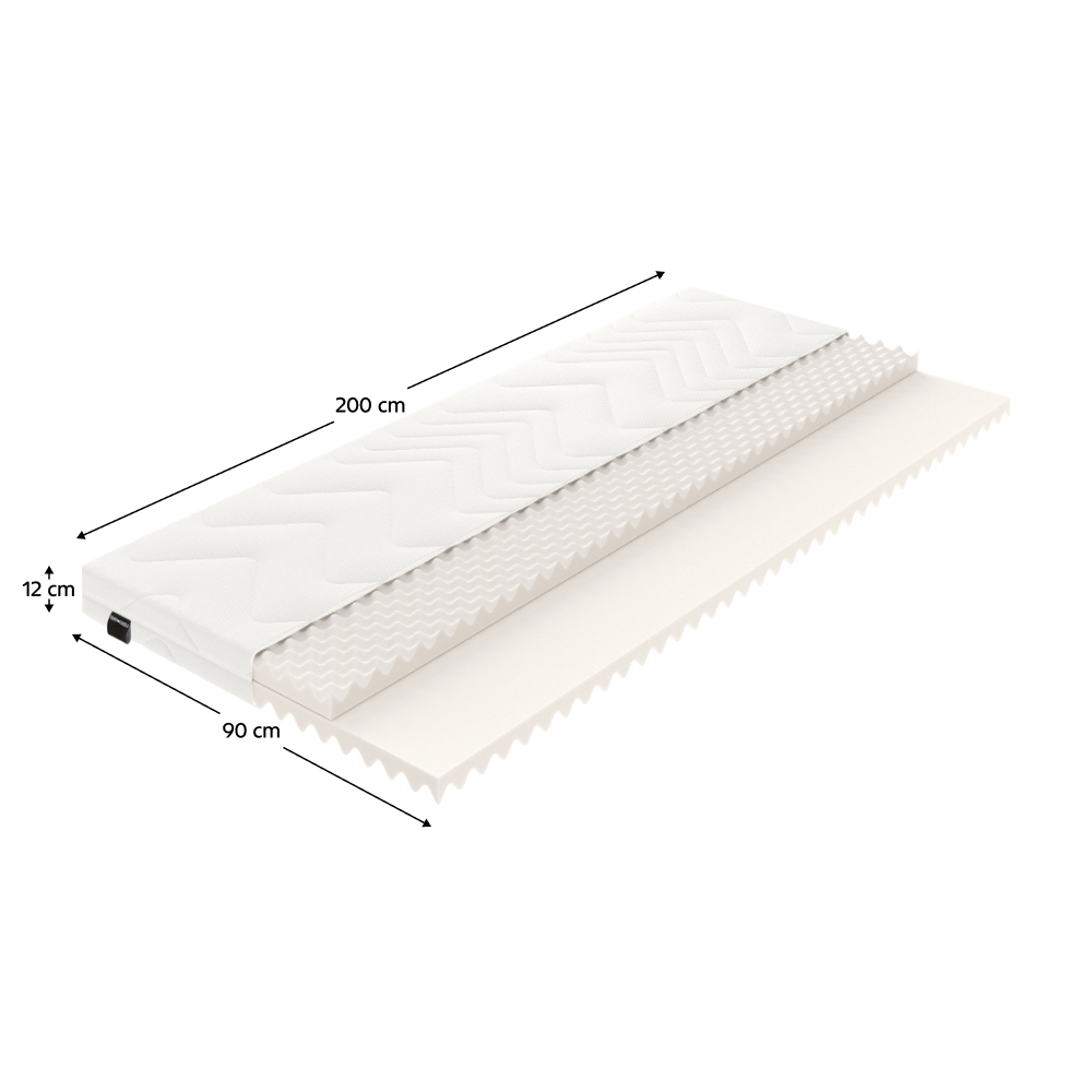 Materiál: elastická pena/poťahRozmery (ŠxD): 90x200 cmVýška matraca: 12 cmNosnosť na osobu: 80 kgObojstrannýTvrdosť matraca: stredne tvrdý H3So zipsomSnímateľnýPrateľný pri teplote do 40 °CPoťah s certifikátom OEKO-TEX STANDARDOdporúčame lamelový roštMinimálne 28 lamielMedzera medzi lamelami max. 6 cmMatrac je vákuovo balený, preto po jeho rozbalení ho odporúčame nechať na rovnom podklade 3-5 dní v pokoji, aby zregeneroval na deklarovanú výšku.