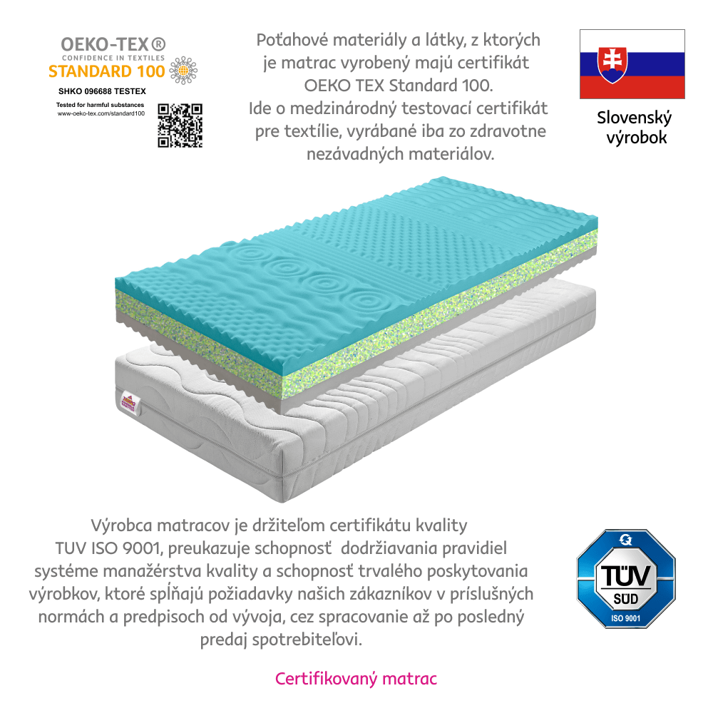 Penový sedem zónový matrac BE KATARÍNA 10 NEW s poťahom CHLOE ACTIVRozmery (ŠxD): 95x200 cmVýška matraca: 14 cmNosnosť: 110 kgTvrdosť matraca: stredne tvrdýFarba PUR peny sa môže líšiťOdporúčame pružný lamelový (predpäté, pružné lamely)Medzera medzi lamelami max. 6 cmHrúbka lamiel 0,5-1 cmMatrac BE KATARINA v rozmere 95x200 cm odporúčame napríklad k posteliam GORETA