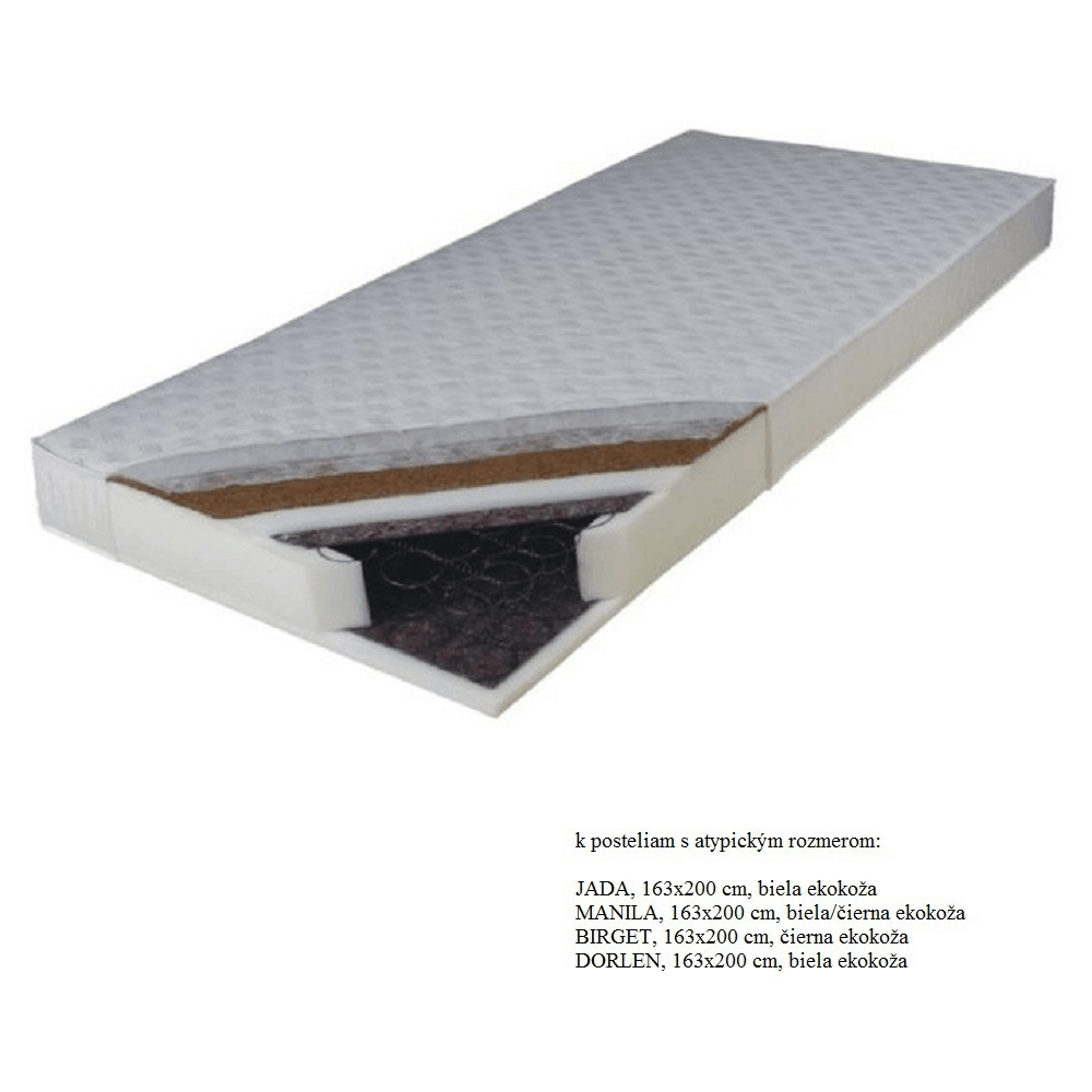 Matrac jednostranný KOKOS MEDIUM ATYPRozmery (ŠxD): 163x200cmVýška matraca: 16 cmMateriál: bonelové pružiny / polyuretánová pena / latexová kokosová doska / bavlnený poťahNosnosť: molitanové strany je 80kg a kokosové strany je 100kg.Tvrdosť matraca: stredne tvrdý T3/tvrdý T4Matrac je v atypickom rozmere 163x200 cm. Je špeciálne vyrobený k posteliam s takýmto vnútorným rozmerom. Matrac odporúčame k posteliam:posteľ JADA, 160x200 cm, ekokoža bielaposteľ MANILA, 160x200 cm, ekokoža biela/čiernaposteľ BIRGET, 160x200 cm, ekokoža čiernaposteľ DORLEN, 160x200 cm, ekokoža biela