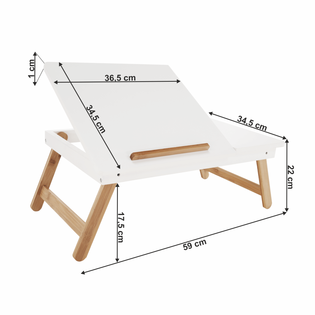 Materiál: MDF/bambusFarba: biela/prírodný bambusRozmery (ŠxHxV): 59x34,5x22 cmVýška priestoru od zeme po policu: 17,5 cmRozmery priehradky: 14,5x14,5x3 cmRozmery vyklápacej časti (ŠxH): 36,5x34,5 cmHrúbka vyklápacej dosky: 1 cmNosnosť: max. 10 kgHmotnosť: 3 kgInovatívny a funkčný dizajnStolík na notebook, bočný stôlDržiak na tabletVhodný ako podnosVyťahovacia priehradka na drobnostiMožnosť nastavenia sklonu: 3 polohyVšestrannýSklápacie nohyJednoduchá manipulácia a prenosDodávané v demonte.