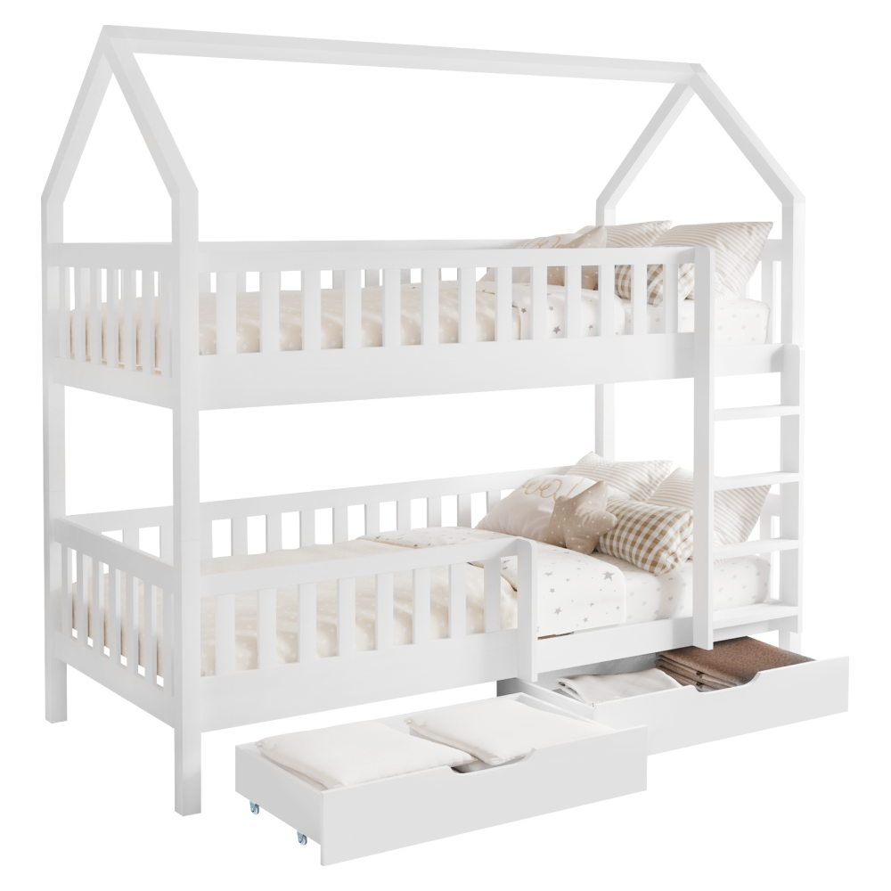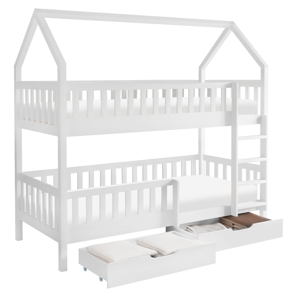 Materiál: borovicové drevo/preglejkaFarba: bielaRozmery (ŠxHxV): 211x97x207 cmPlocha na spanie (ŠxD): 90x200 cmHrúbka materiálu: 2 cmVýška medzi spodným a horným lôžkom: 124 cmPosteľ v tvare domčekaNosnosť na horné lôžko: 90 kgNosnosť na spodné lôžko: 95 kgNa nožičkáchVýška nožičiek: 21 cmDva šuplíkyRozmer šuplíka (ŠxV): 93x17 cmS rebríkomS bezpečnostnou bariérouMožnosť namontovať zábranu a rebrík na ľavú alebo pravú stranuDodávaná bez matracaMožnosť zakúpiť pružinový matrac z našej ponukyOdporúčaná výška matraca na horné lôžko: max. 14 cmOdporúčaná výška matraca na spodné lôžko: max. 18 cmDodávaná s preglejkovými rolovanými roštamiRozložiteľná na dve lôžkaDodávané v demonte