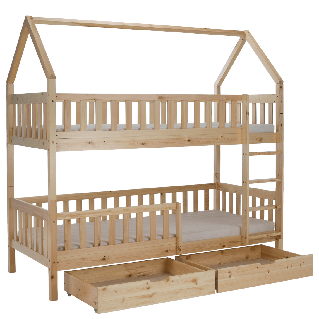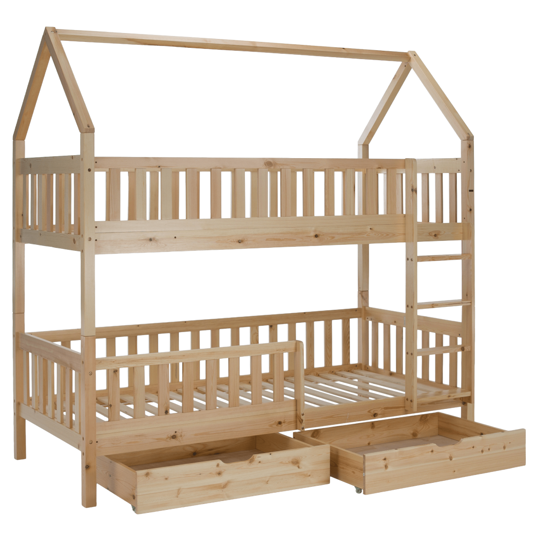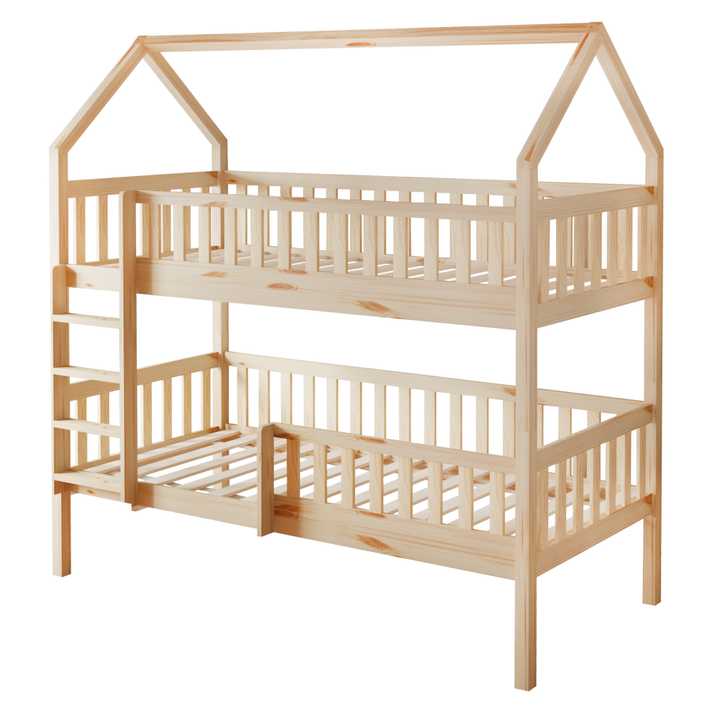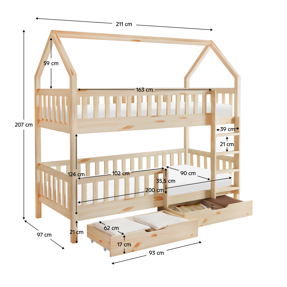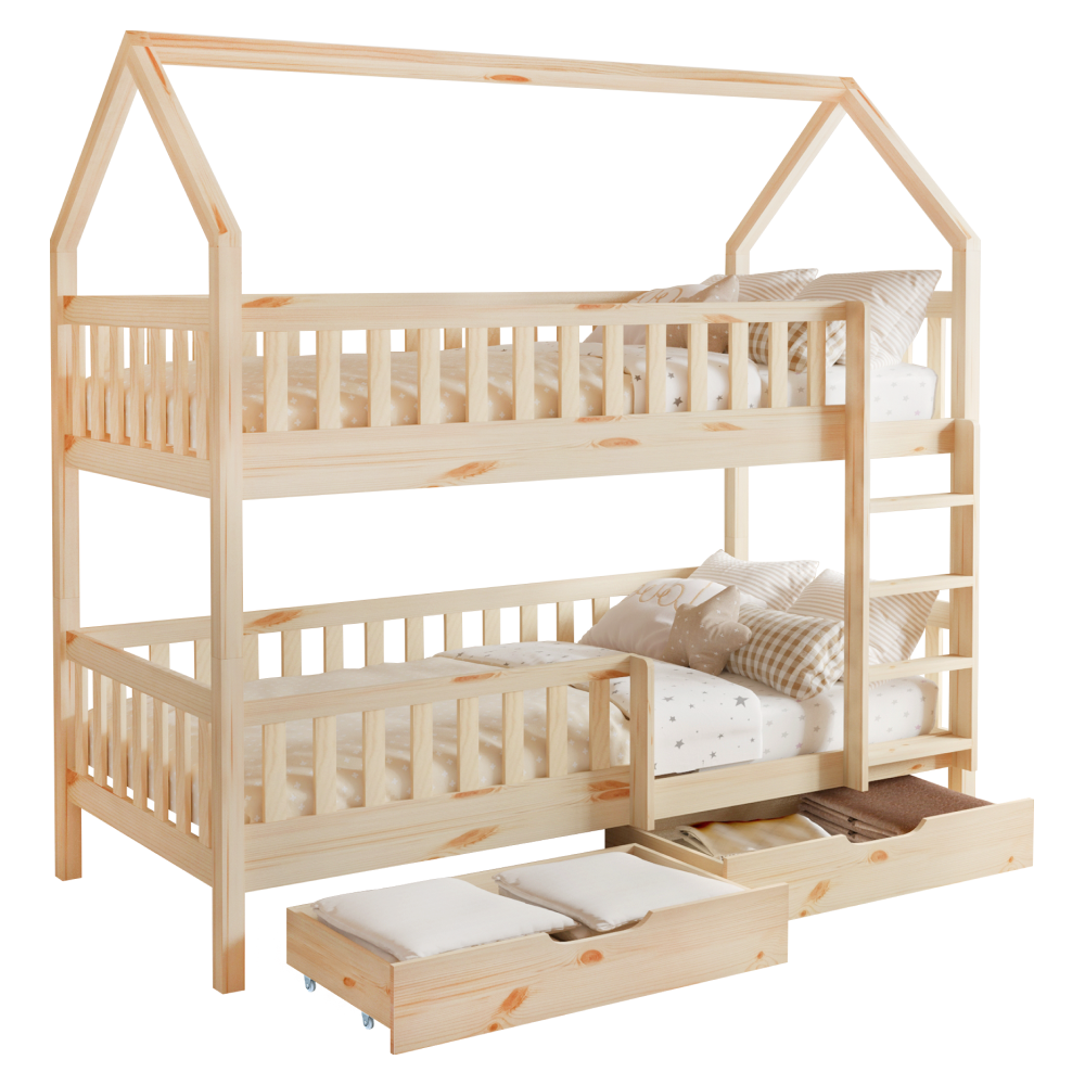 Materiál: borovicové drevo/preglejkaFarba: prírodnáRozmery (ŠxHxV): 211x97x207 cmPlocha na spanie (ŠxD): 90x200 cmHrúbka materiálu: 2 cmVýška medzi spodným a horným lôžkom: 124 cmPosteľ v tvare domčekaNosnosť na horné lôžko: 90 kgNosnosť na spodné lôžko: 95 kgNa nožičkáchVýška nožičiek: 21 cmDva šuplíkyRozmer šuplíka (ŠxV): 93x17 cmS rebríkomS bezpečnostnou bariérouMožnosť namontovať zábranu a rebrík na ľavú alebo pravú stranuDodávaná bez matracaMožnosť zakúpiť pružinový matrac z našej ponukyOdporúčaná výška matraca na horné lôžko: max. 14 cmOdporúčaná výška matraca na spodné lôžko: max. 18 cmDodávaná s preglejkovými rolovanými roštamiRozložiteľná na dve lôžkaDodávané v demonte