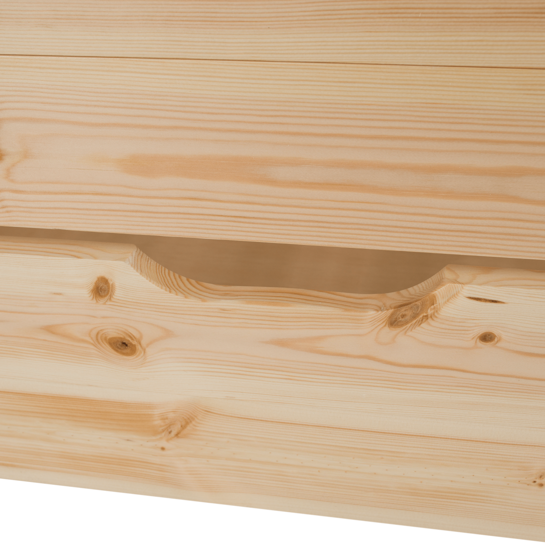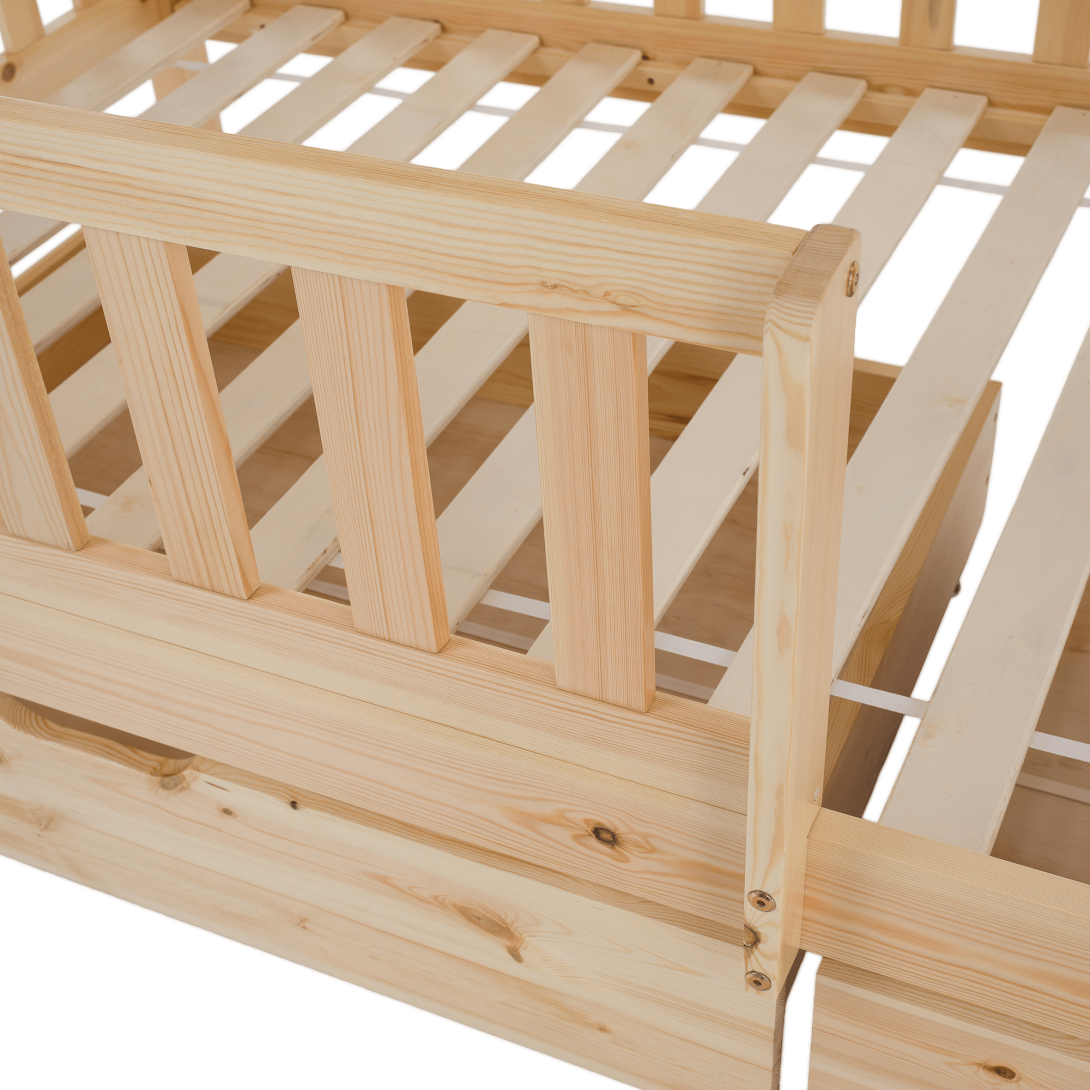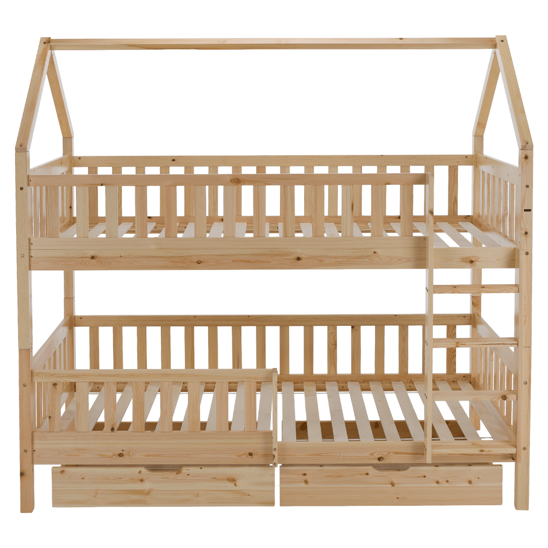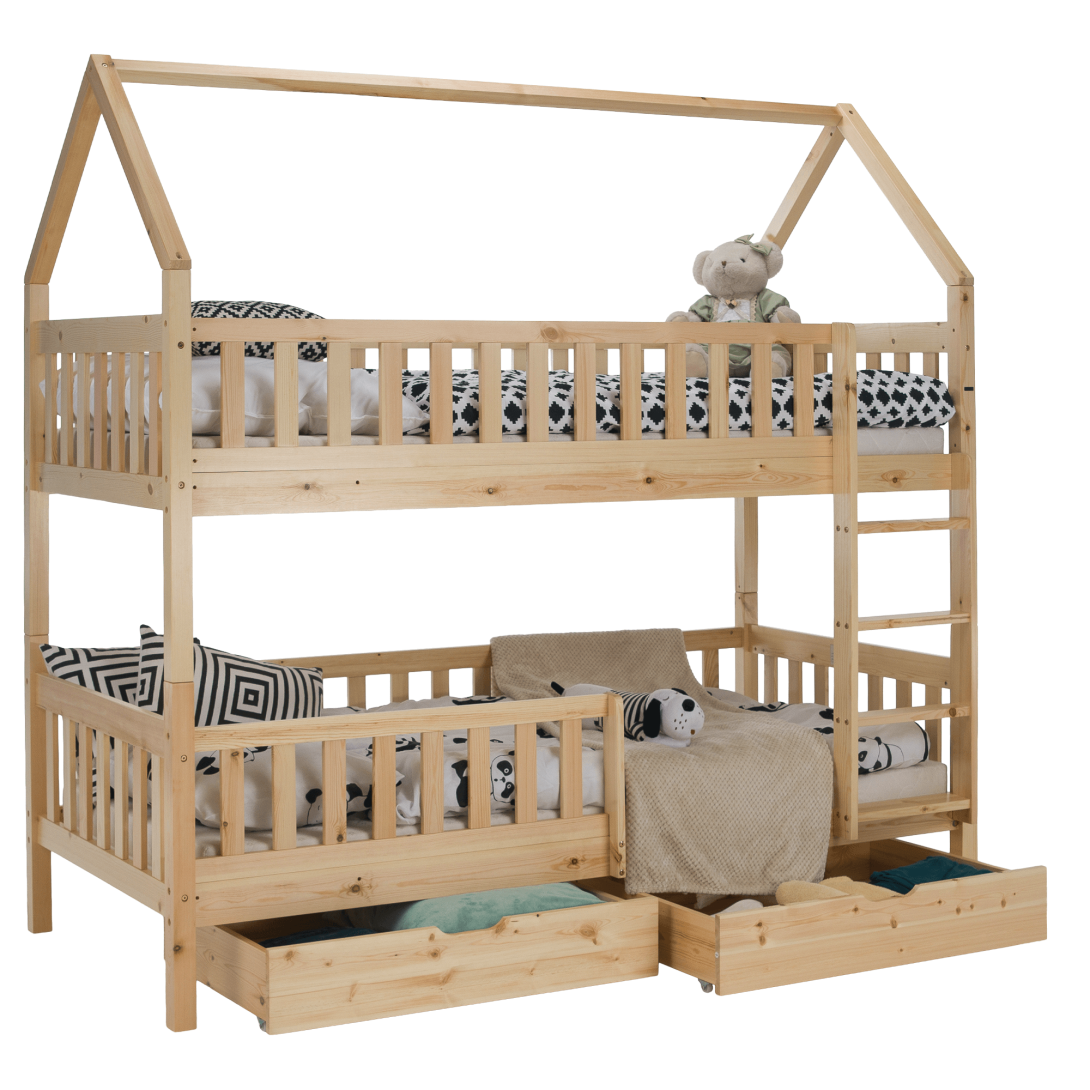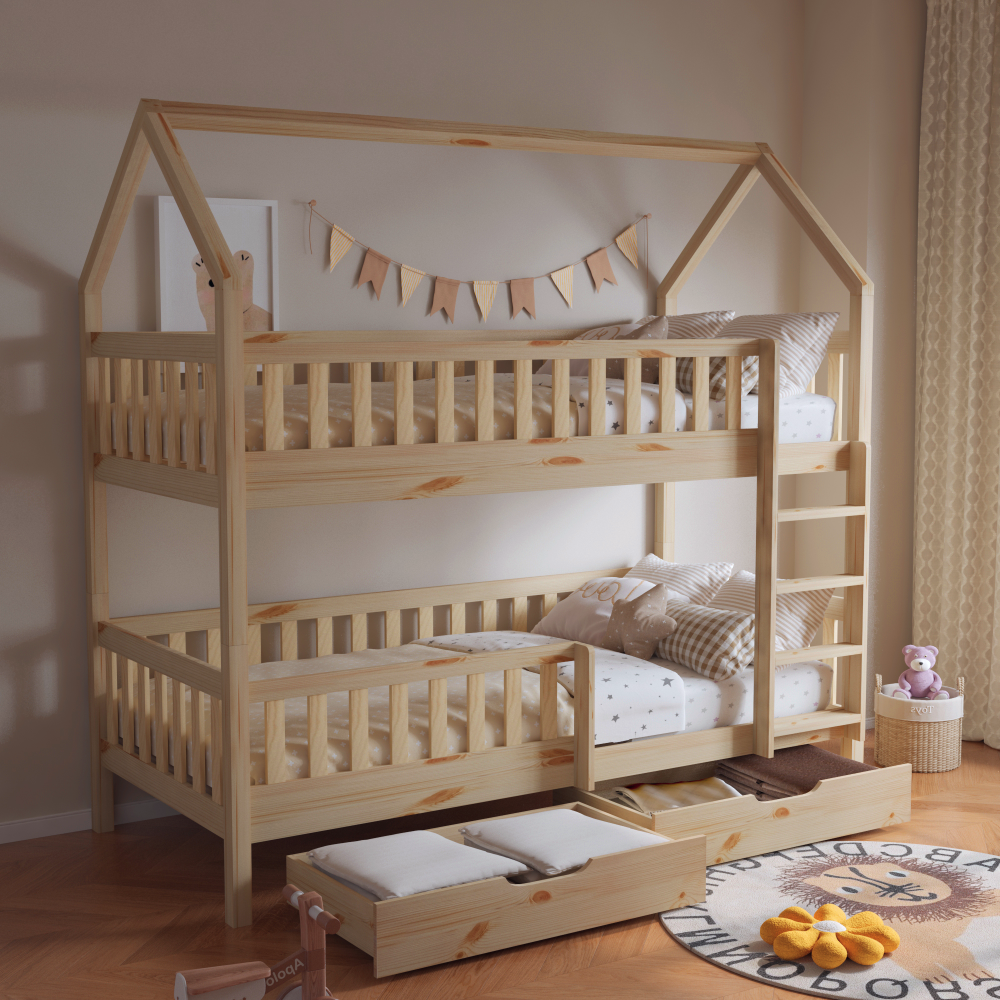 Materiál: borovicové drevo/preglejkaFarba: prírodnáRozmery (ŠxHxV): 211x97x207 cmPlocha na spanie (ŠxD): 90x200 cmHrúbka materiálu: 2 cmVýška medzi spodným a horným lôžkom: 124 cmPosteľ v tvare domčekaNosnosť na horné lôžko: 90 kgNosnosť na spodné lôžko: 95 kgNa nožičkáchVýška nožičiek: 21 cmDva šuplíkyRozmer šuplíka (ŠxV): 93x17 cmS rebríkomS bezpečnostnou bariérouMožnosť namontovať zábranu a rebrík na ľavú alebo pravú stranuDodávaná bez matracaMožnosť zakúpiť pružinový matrac z našej ponukyOdporúčaná výška matraca na horné lôžko: max. 14 cmOdporúčaná výška matraca na spodné lôžko: max. 18 cmDodávaná s preglejkovými rolovanými roštamiRozložiteľná na dve lôžkaDodávané v demonte