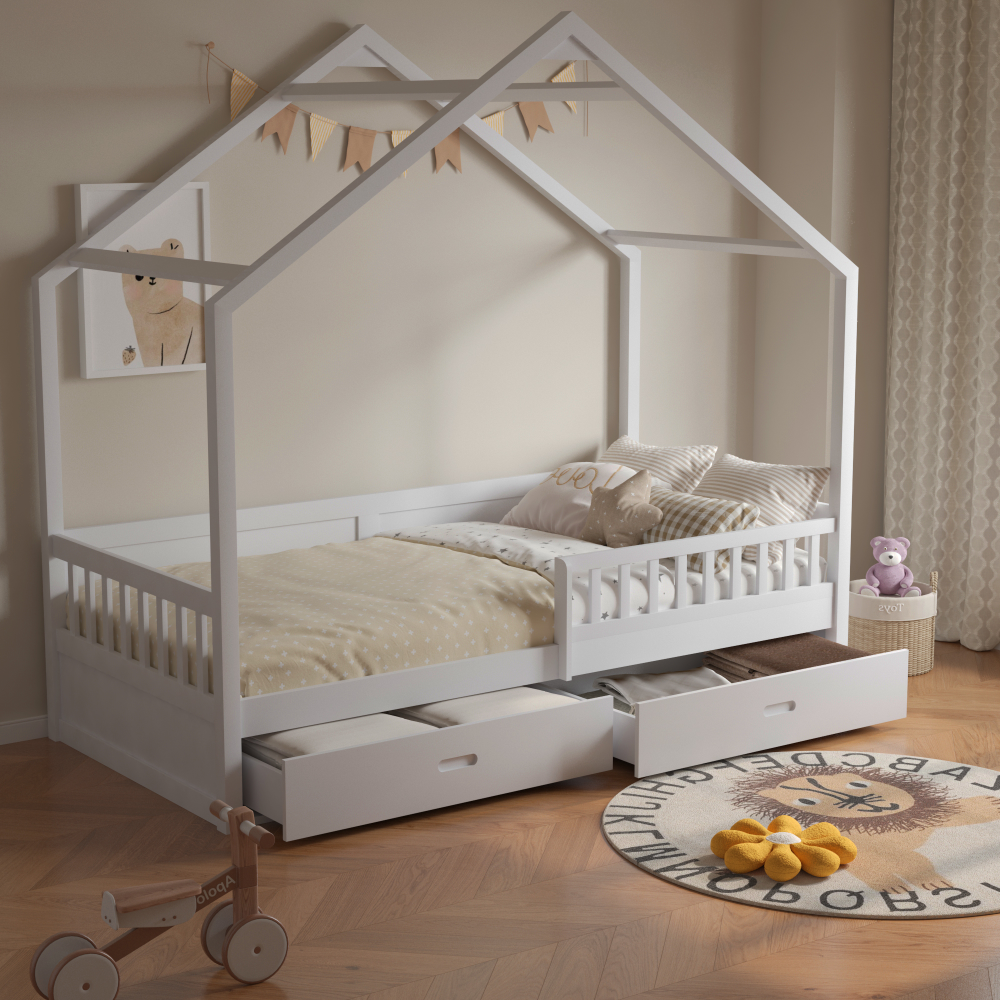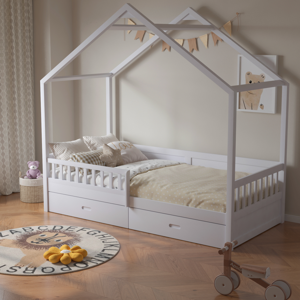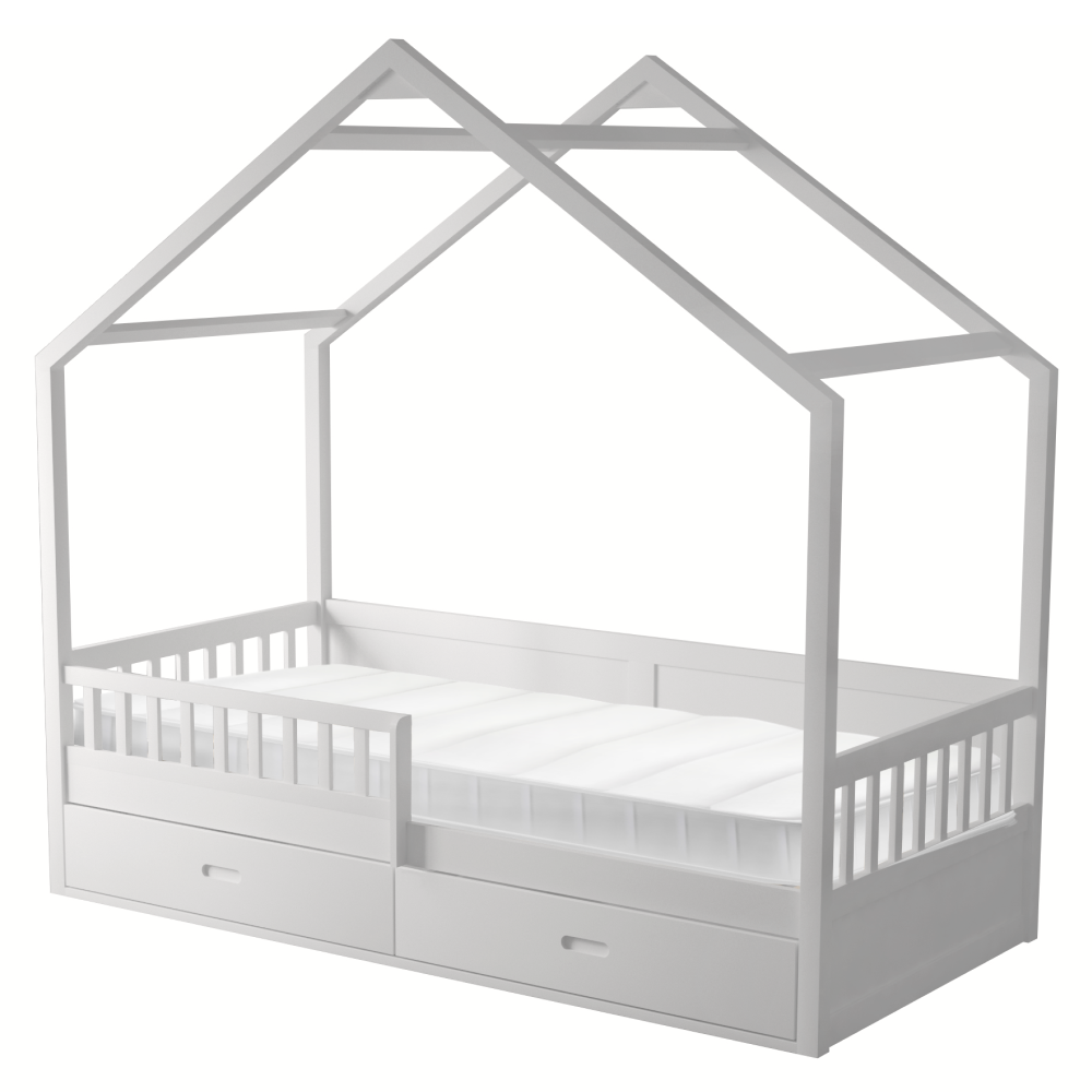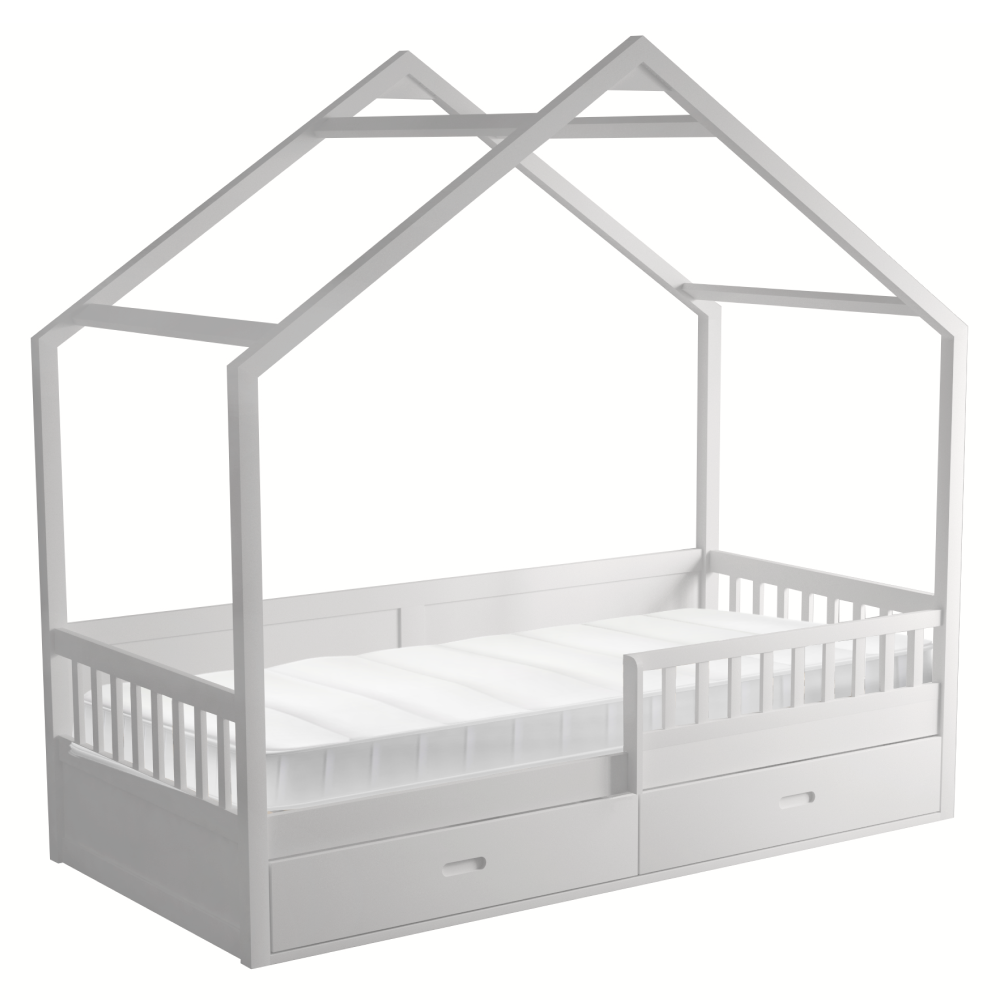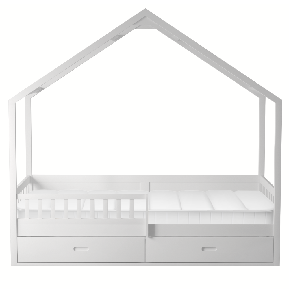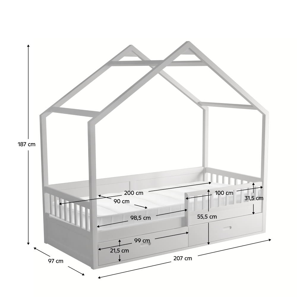 Materiál: masív borovicaFarba: bielaRozmery (ŠxHxV): 207x97x187 cmPlocha na spanie (ŠxD): 90x200 cmHrúbka materiálu: 2 cmVýška po rošt: 27 cmNosnosť: 95 kgÚložný priestorDva šuplíkyRozmer šuplíka (ŠxHxV): 99x62x21,5 cmNosnosť šuplíka: 10 kgMožnosť namontovať zábranu na ľavú alebo pravú stranuVýška zábrany: 32 cmPosteľ v tvare domčekaDodávaná s preglejkovým rolovaným roštomDodávaná bez matracaMožnosť zakúpiť pružinový matrac z našej ponukyOdporúčaná maximálna výška matraca: 12 cmDodávané v demonte