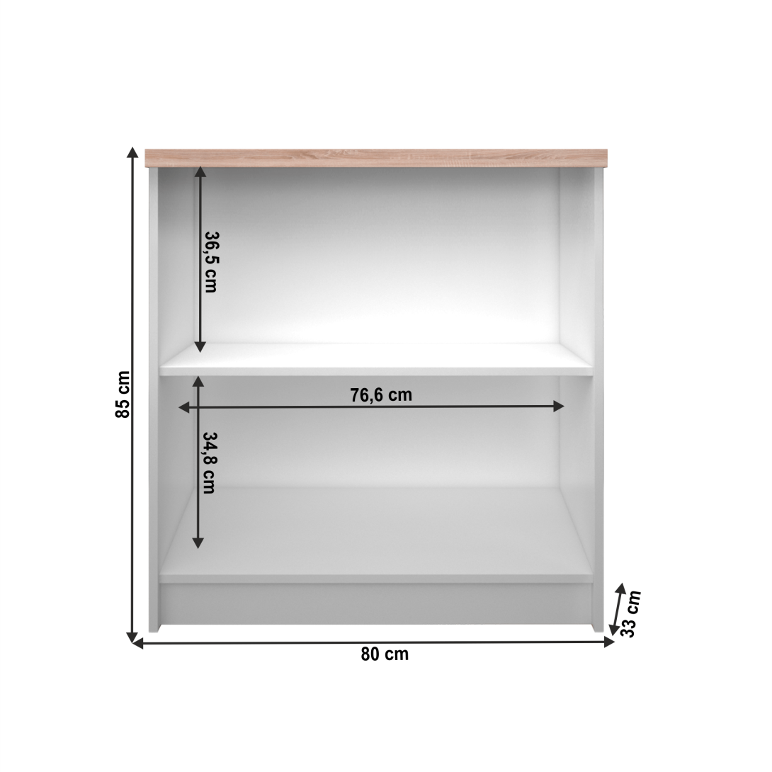 Regál nízky otvorený 80 zo sektorového systému TOPTY 16Materiál: laminovaná DTDFarebné prevedenie: biela/dub sonomaRozmery (ŠxHxV):80x33x85 cmHrúbka materiálu korpus: 16 mmHrúbka materiálu vrchnej dosky: 32 mmDodávané v demonte.