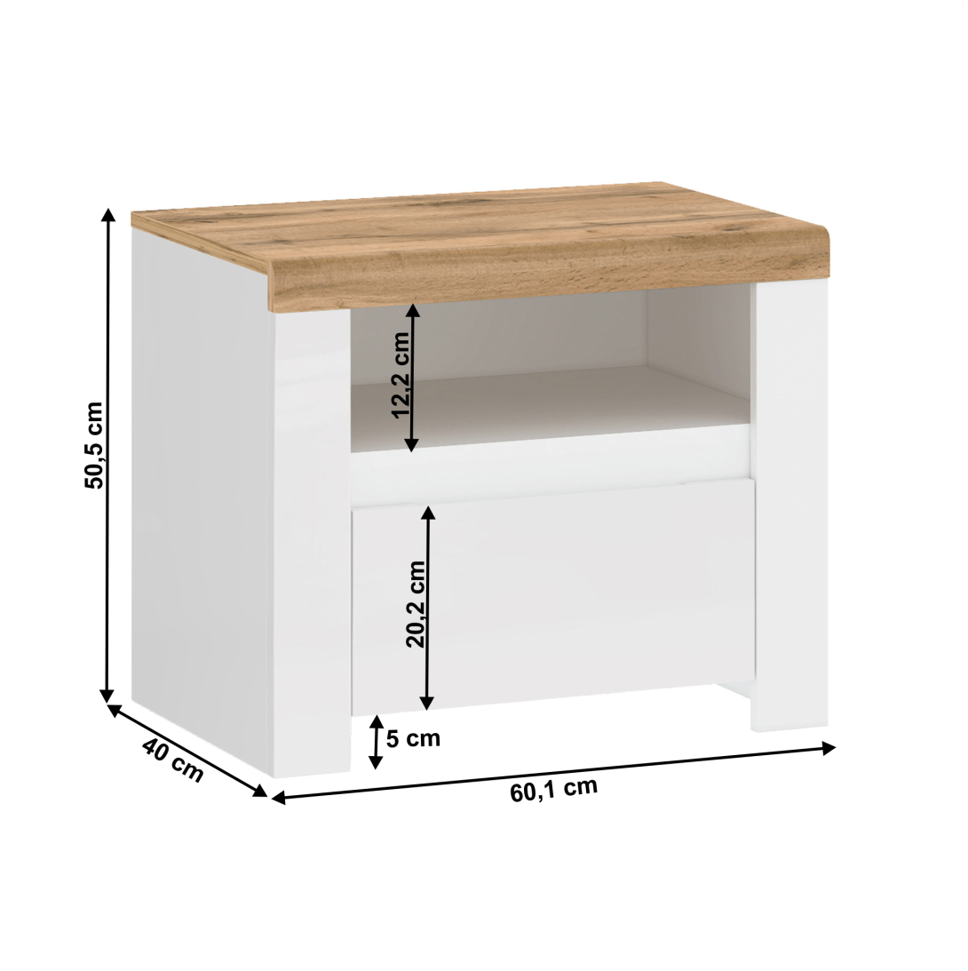 Materiál: DTD laminovaná/ABS hrany/MDFFarba: biely extra vysoký lesk/dub wotanRozmery (ŠxHxV): 60,1x40x50,5 cmVýška spodného priestoru od podlahy: 5 cmHrúbka materiálu: 1,6 - 2,2 cmMDF dvierkaOtváranie/zatváranie pomocou výrezuS jednou zásuvkou a otvorenou odkladacou plochou Výška zásuvky: 20,2 cmVýška otvorenej odkladacej plochy: 12,2 cmDodávaný v demonte
