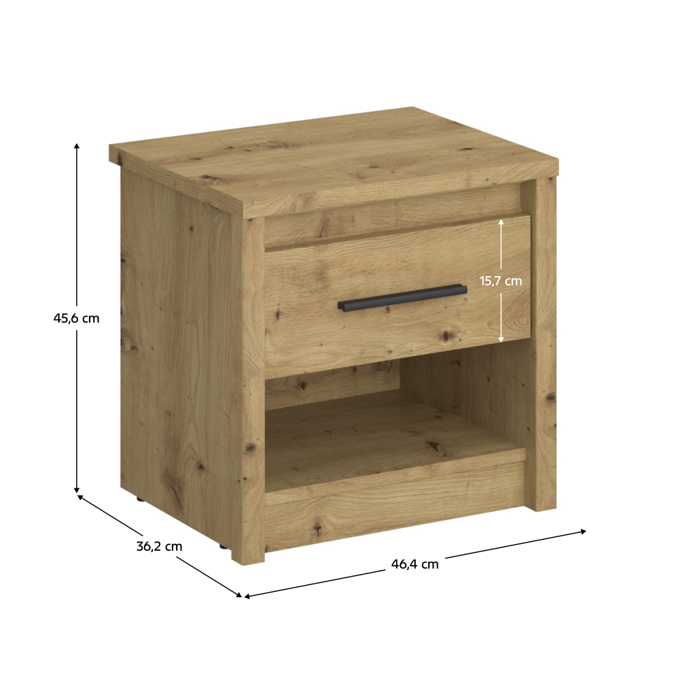 Materiál: DTD laminovaná/ABS hranyFarba: dub artisanRozmery (ŠxHxV): 46,4x36,2x45,6 cmHrúbka materiálu: 1,6-3,2 cmPlastové úchytkyFarba úchytiek: čiernaOtvorená odkladacia plochaŠuplíkVýška šuplíka: 15,7 cmPlastové nožičkyModerný dizajnDodávané v demonte