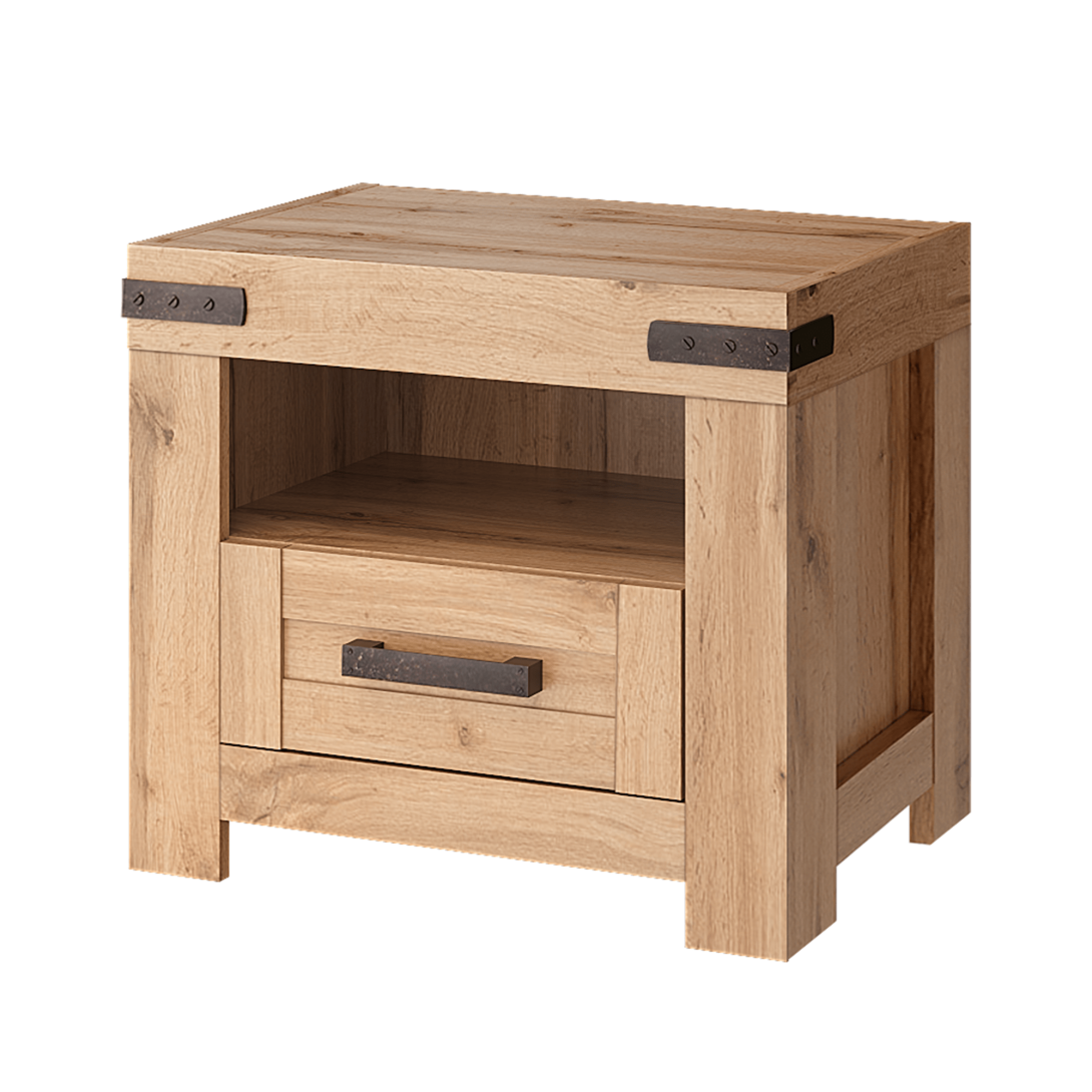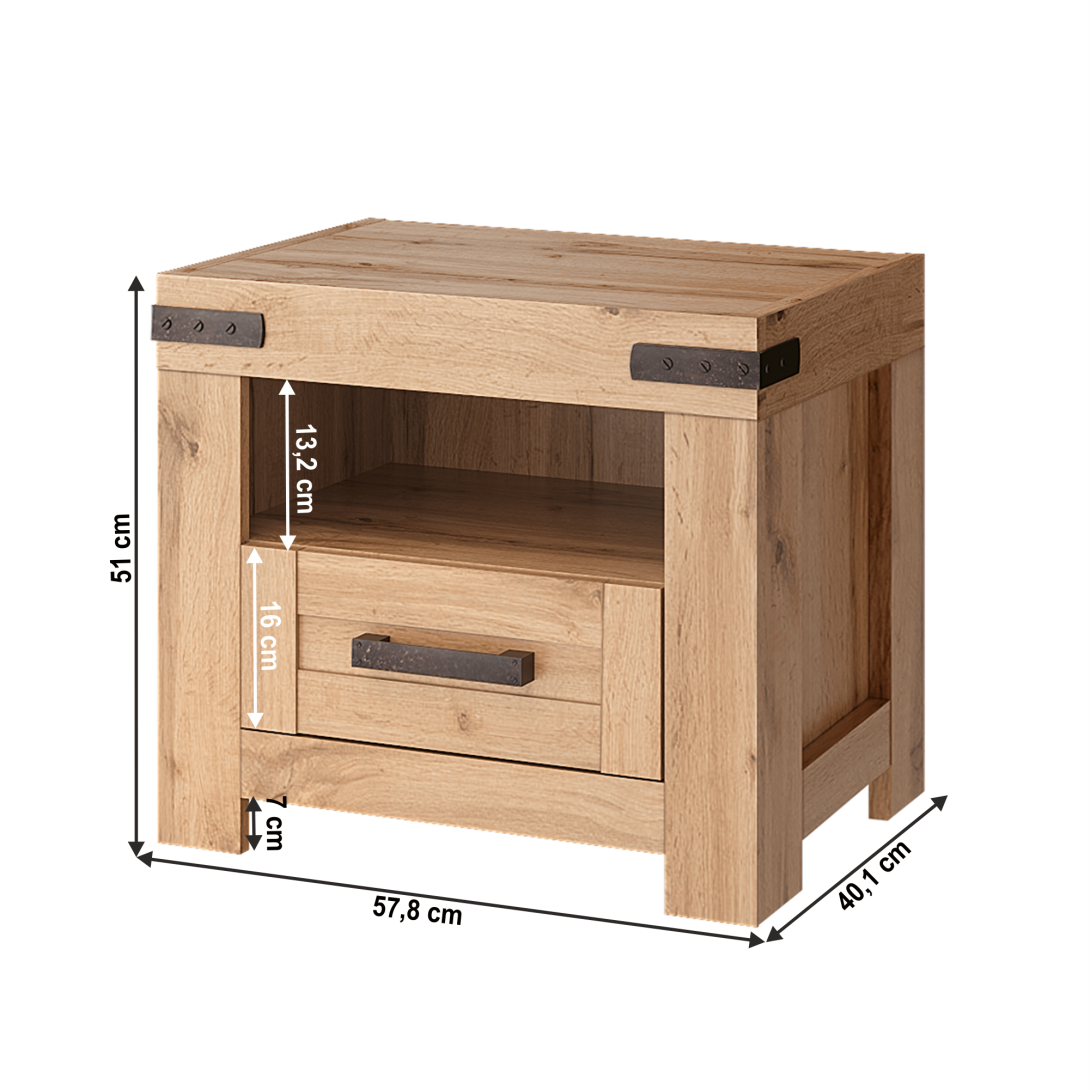Nočný stolík MORATIZ 1SMateriál: DTD laminovaná/MDF/plastFarba: dub wotanRozmery (ŠxHxV): 57,8x40,1x51 cmVýška nožičiek: 7 cmHrúbka materiálu: 1,6- 2,2 cm KombinovanýJeden šuplíkVýška šuplíka: 16 cmOtvorená odkladacia plochaVýška otvorenej odkladacej plochy: 13,2 cmMDF dvierkaDodávaná v demonte