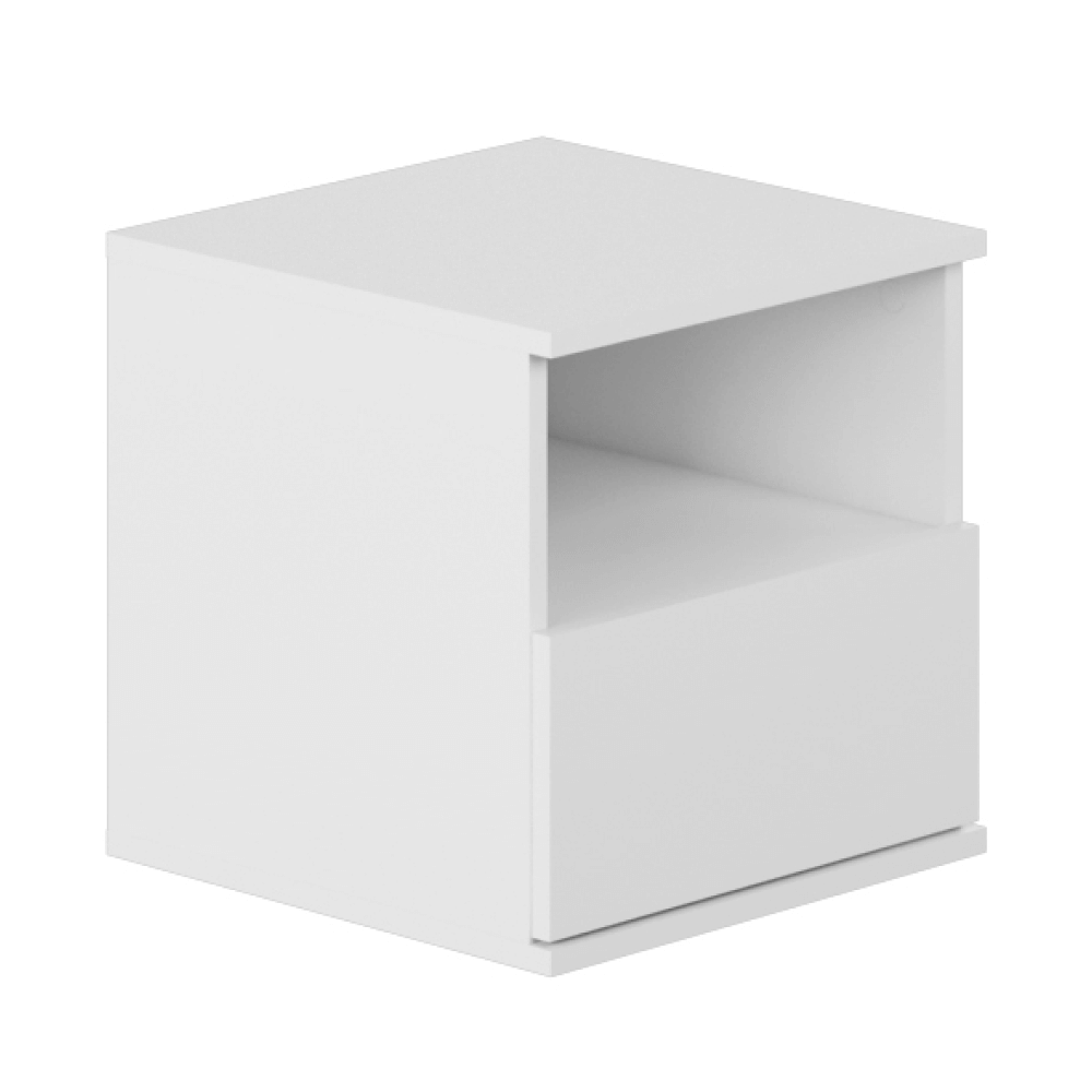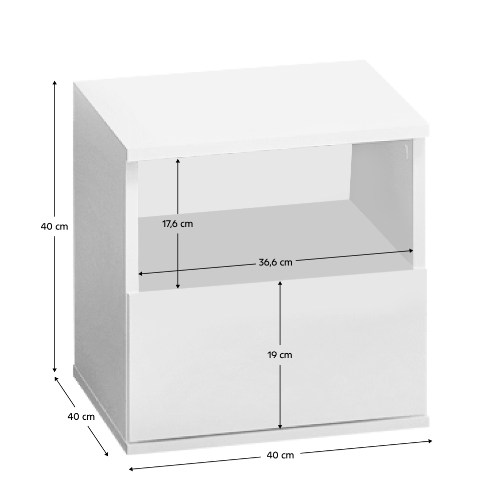 Materiál: laminovaná DTDFarba: bielaRozmery (ŠxHxV): 40x40x40 cmHrúbka laminovanej DTD: 1,6 cmŠuplíkVýška šuplíka: 19 cmNosnosť šuplíka: 5 kgOtvorená odkladacia plochaVýška otvorenej odkladacej plochy: 17,6 cmPlastové nožičky- klzákyNosnosť: 10 kgBez úchytiekModerný dizajnKvalitný slovenský výrobokDodávané v demonte