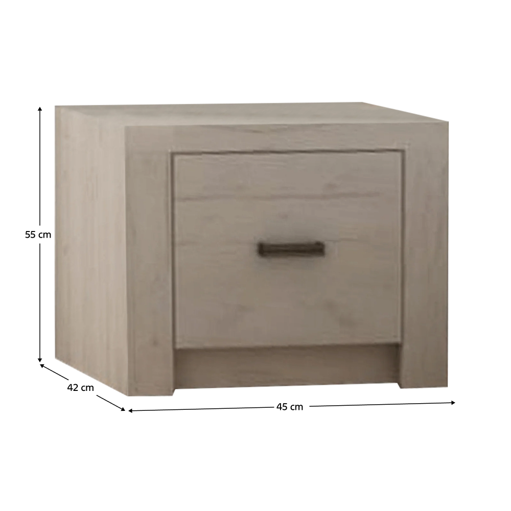 Nočný stolík z luxusného sektorového nábytku. úchytky kovovéMateriál: DTD laminovaná/ABS hrany, farebné prevedenie: jaseň biely, Rozmery ŠxHxV: 45x42x55 cm. Hrúbka materiálu: 48 mm,hrúbka materiálu zvyšné časti: 16 mmDodávané v demonte.