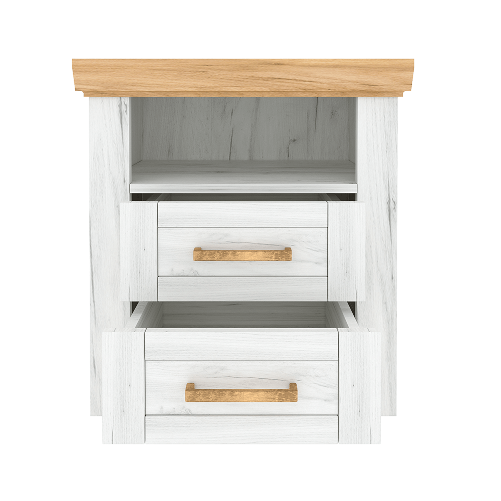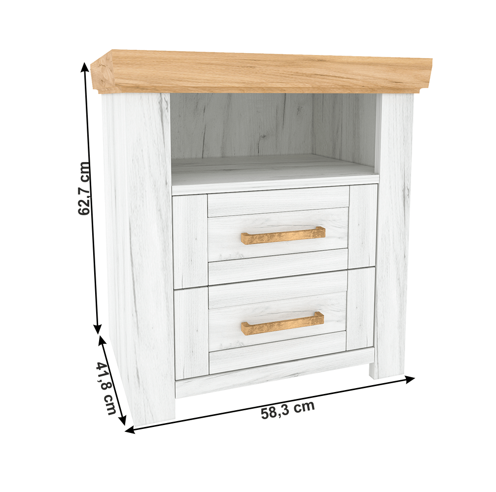 Materiál: DTD laminovanáFarba: dub craft zlatý/dub craft bielyRozmery (ŠxHxV): 58,3x41,8x62,7 cmHrúbka materiálu korpus: 16 mmHrúbka materiálu vrchná doska: 22 mmVýška spodného priestoru od podlahy je 4,2 cmDva šuplíkyOtvorený priestorDodávané v demonte