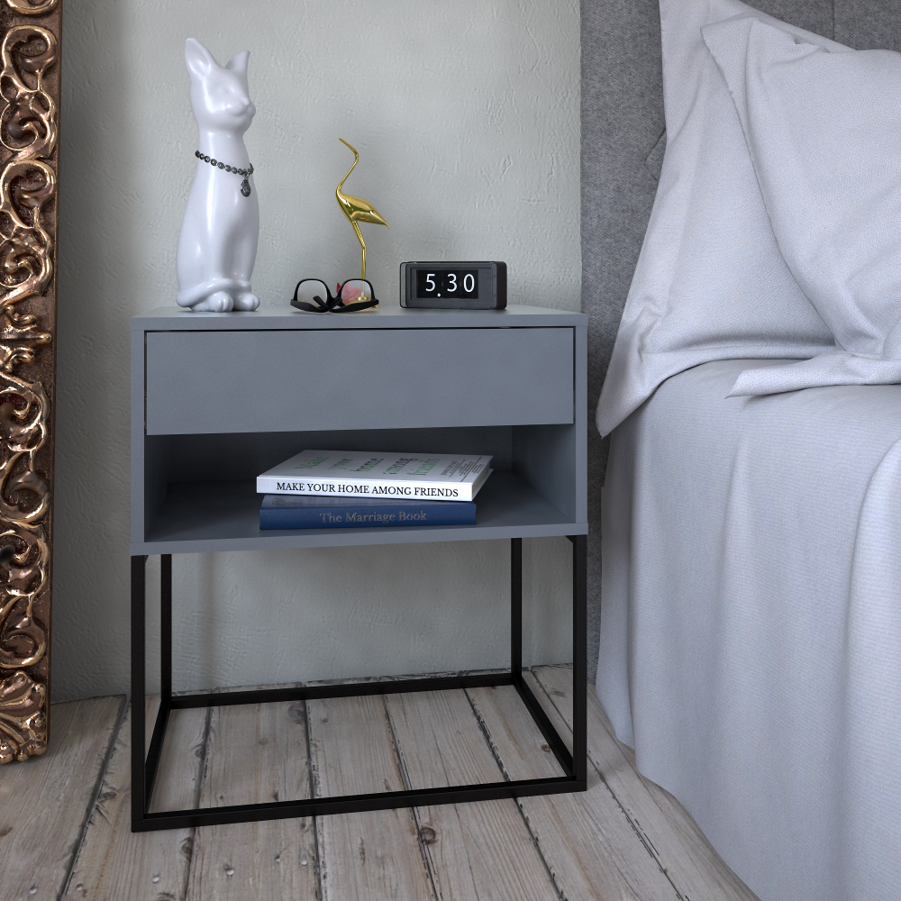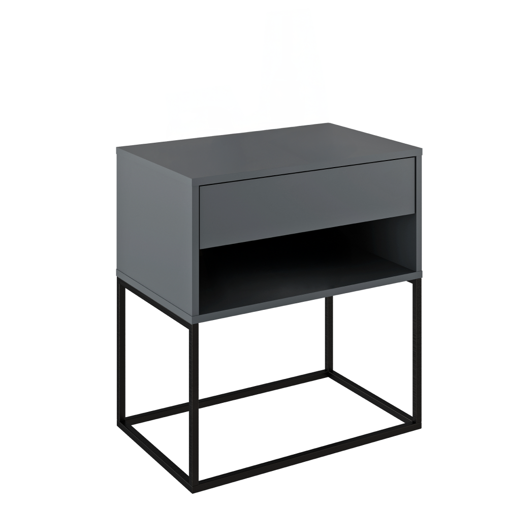 Materiál: DTD laminovaná/kovFarba: grafit/čiernaRozmery (ŠxHxV): 60x38,4x65 cmHrúbka materiálu: 1,6 cmOtvorený úložný priestorRozmery otvoreného úložného priestoru (ŠxV): 56,6x13,5 cmJeden šuplíkVýška šuplíka: 13 cmKovová podstavaVýška podstavy: 35 cmNočný stolíkPríručný stolíkNosnosť: 10 kgNosnosť šuplíka: 5 kgOdporúčame pripevniť k steneKvalitný slovenský výrobokDodávané v demonte