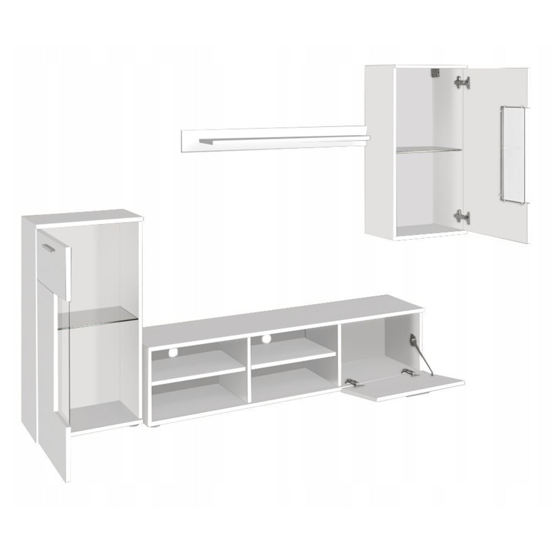 Obývacia stena FRONTAL 1 NEW s LED osvetlením (studená biela), Materiál: fóliovaná DTD/skloFarba: bielaRozmery (ŠxHxV): 230x38,5x190 cmZávesná skrinka s vitrínou (ŠxHxV): 55x32x105 cmStojacia skrinka s vitrínou (ŠxHxV): 55x32x106 cmRTV stolík (ŠxHxV): 175x38x41 cmPolica (ŠxHxV):120x18x12 cmNosnosť závesnej skrinky s vitrínou: 10kgNosnosť stojacej skrinky s vitrínou: 10kgNosnosť police: 5kgHrúbka materiálu: 16 mmDodávané s LED osvetlenímDvojbodové LED osvetlenie Farba LED osvetlenia: studená bielaDodávané v demonte