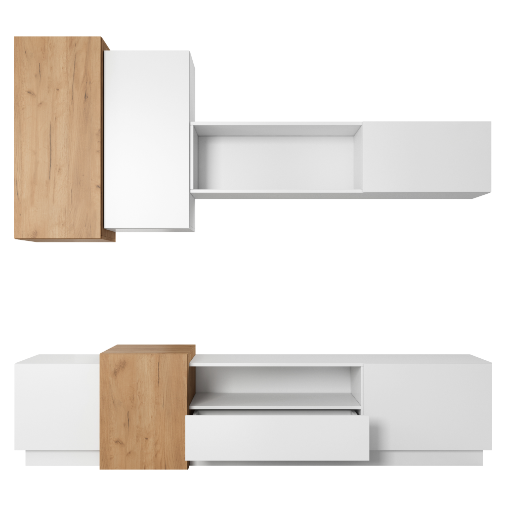 Materiál: DTD laminovaná/ABS hranyFarba: biela/dub craft zlatýRozmery (ŠxHxV): 220-270x45x180 cmRTV stolíkTri skrinky, jeden šuplík, otvorený priestorHĺbka užšej skrinky a skrinky s otvorenou časťou: 40,4 cmHĺbka strednej skrinky: 45,4 cmŠírka ľavej a strednej skrinky: 40 cmŠírka skrinky s otvorenou časťou: 140 cmRozmery šuplíka (ŠxHxV): 79,6x33,4x19,6 cmZávesná dvojdverová skrinkaZávesná skrinka s otvoreným priestoromS dotykovým systémom PUSH UPDizajnováDodávané v demonte