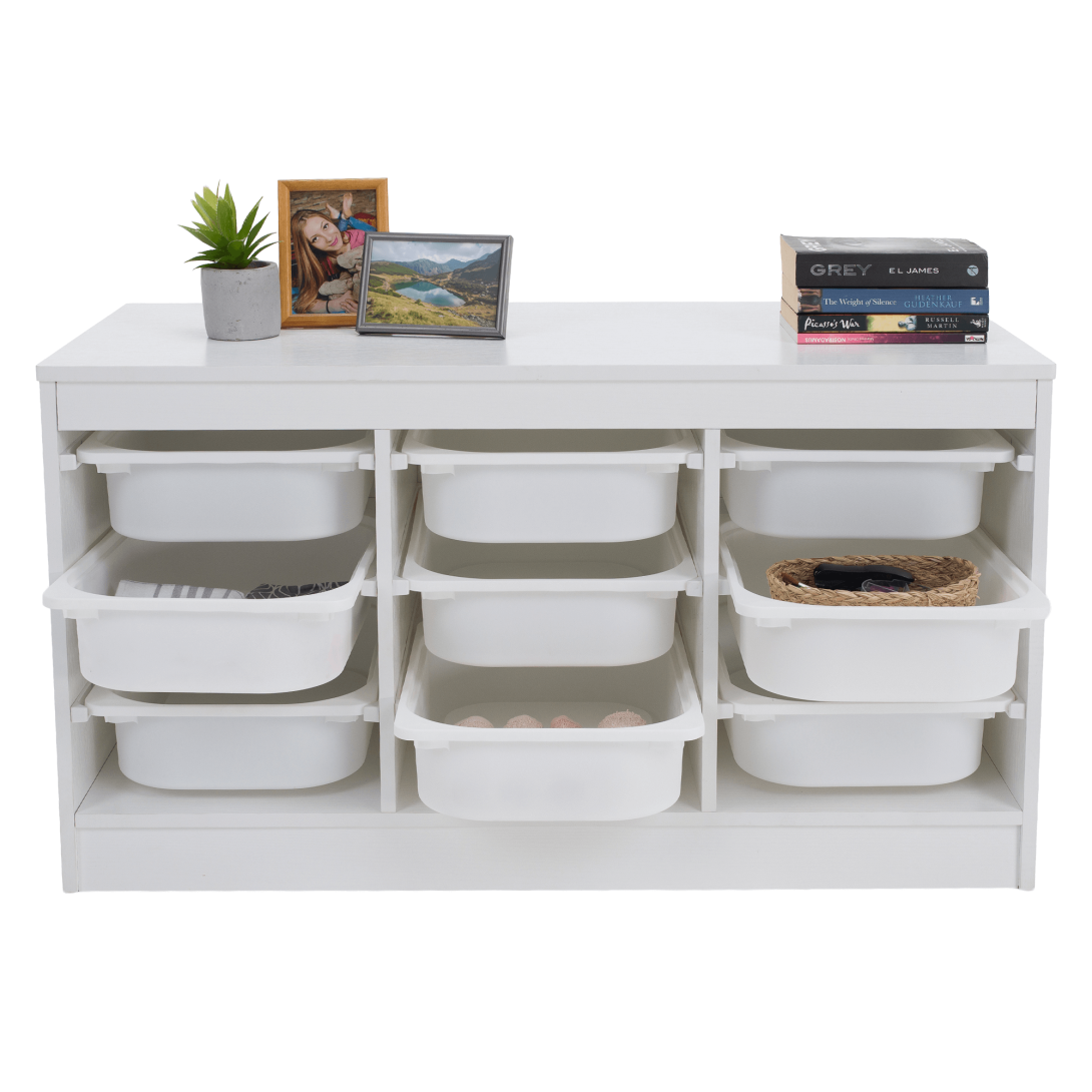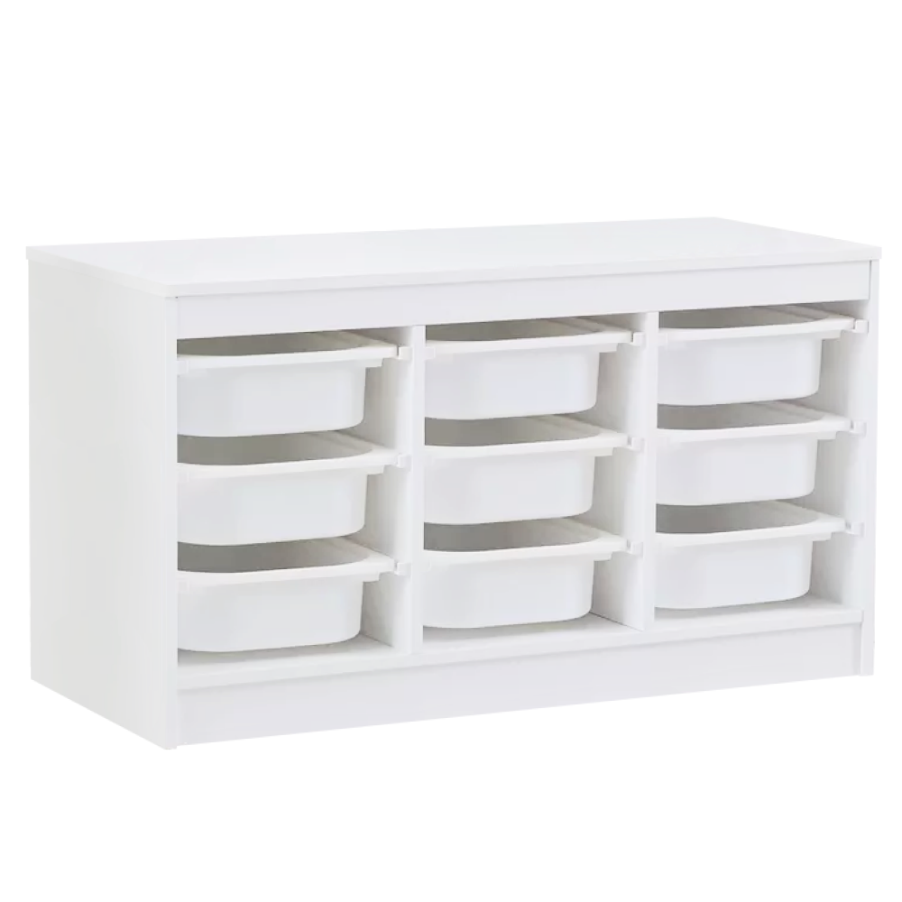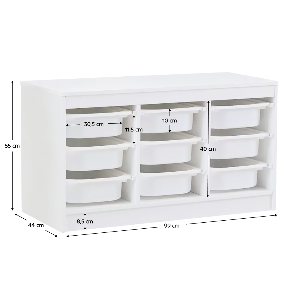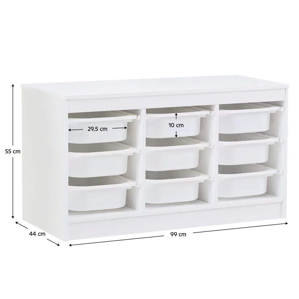 Materiál: MDF/plastFarba: bielaRozmery (ŠxHxV): 99x44x55 cmNosnosť boxu: 50 kgNosnosť vrchnej dosky: 120 kgRozmery boxu (ŠxHxV): 29,5x41,5x10 cmTrojposchodový9 boxovVhodný do detskej izby alebo kancelárieNa hračky, kancelárske potreby alebo iné drobnostiRegálOrganizérPraktickýViacúčelovýDodávané v demonte