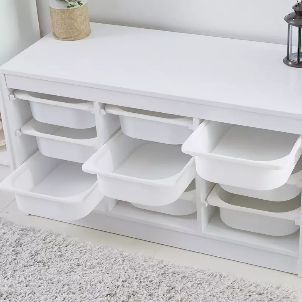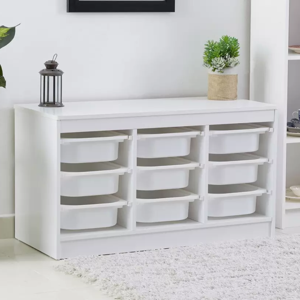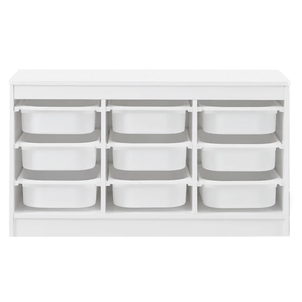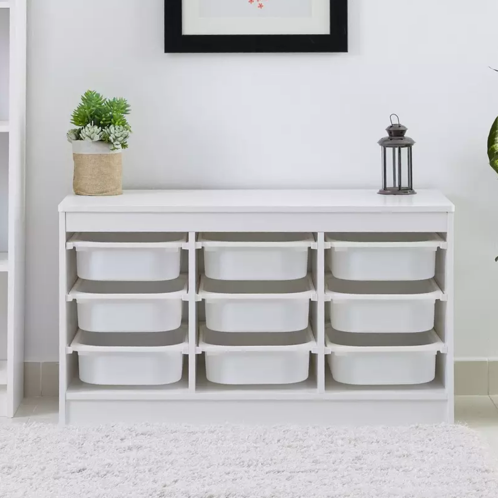 Materiál: MDF/plastFarba: bielaRozmery (ŠxHxV): 99x44x55 cmNosnosť boxu: 50 kgNosnosť vrchnej dosky: 120 kgRozmery boxu (ŠxHxV): 29,5x41,5x10 cmTrojposchodový9 boxovVhodný do detskej izby alebo kancelárieNa hračky, kancelárske potreby alebo iné drobnostiRegálOrganizérPraktickýViacúčelovýDodávané v demonte